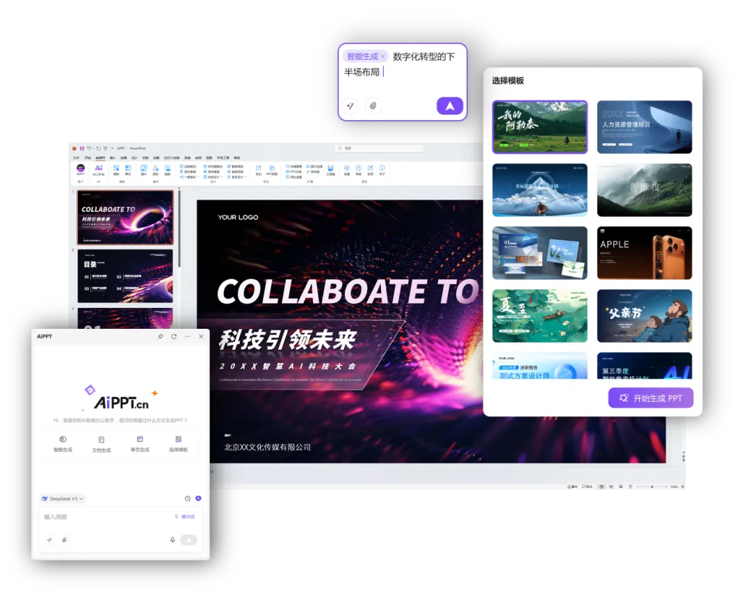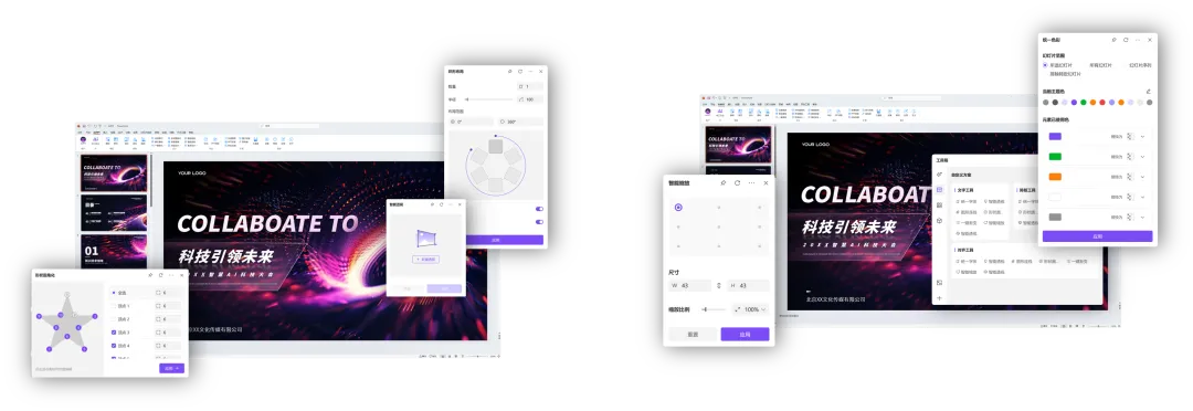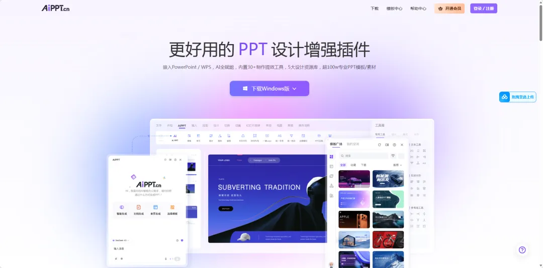 嵌入PoWerPoint/WPS,AI全赋能,内置30+制作提效工具,5大设计资源库,超100w专业PPT模板/素材