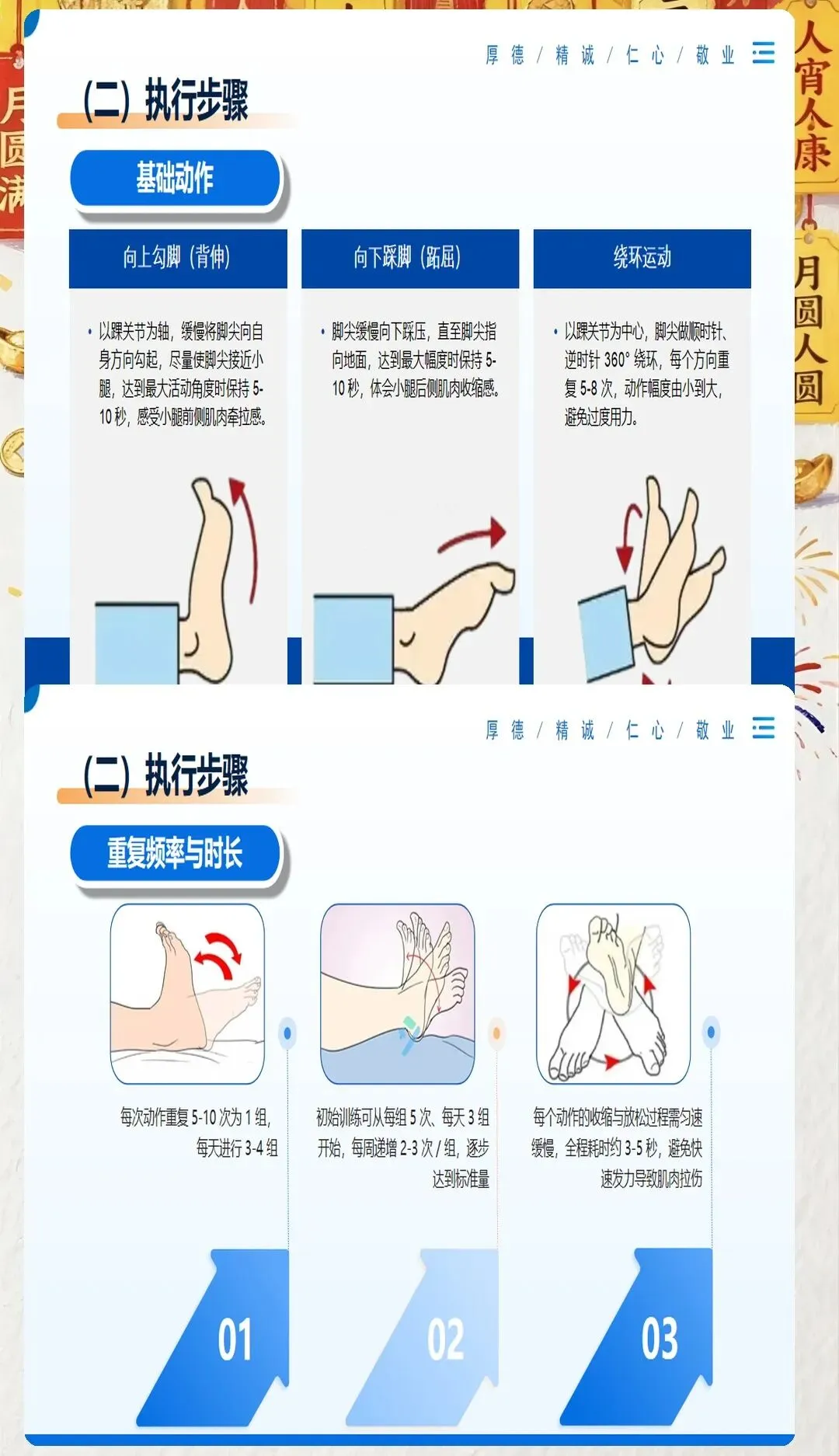 环绕运动:患者取仰卧位或者坐位,下肢伸直,以踝关节为中心,缓慢将脚尖顺时针环绕10-15圈,然后再逆时针环绕10-15圈。环绕运动的速度不宜过快,要保持动作的平稳和连贯。每次环绕运动可以进行2-3组,每天可以进行3-4组。