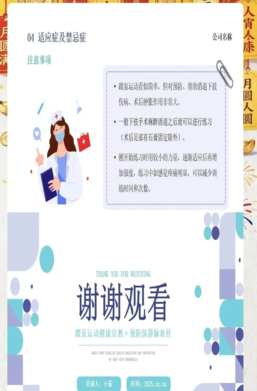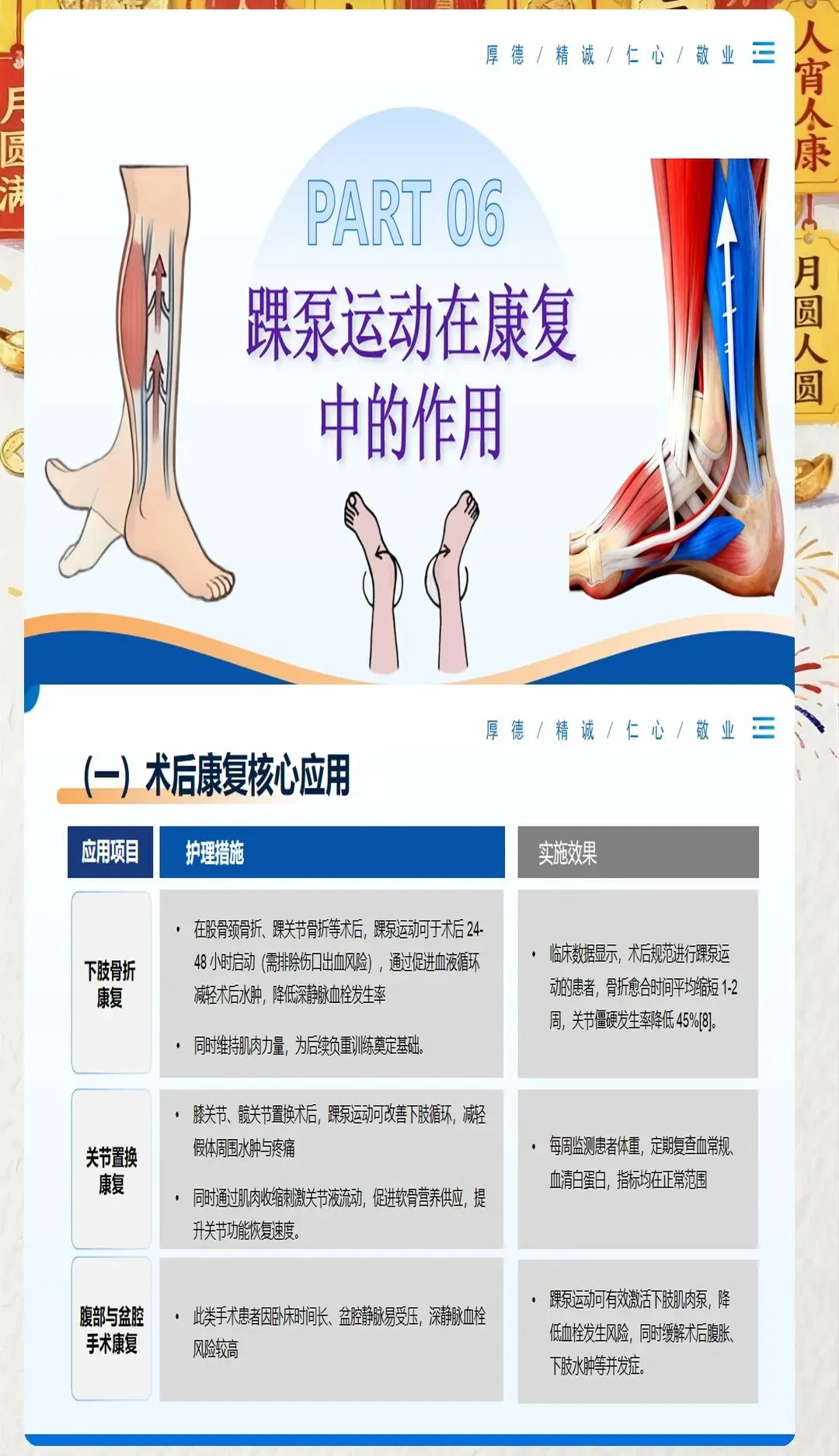 在临床工作中,我们常常会遇到一些患者因为术后长期卧床、肢体活动受限等原因,出现下肢肿胀、疼痛等不适症状,甚至引发深静脉血栓这一严重并发症。深静脉血栓一旦脱落,可能会随血液流动堵塞肺动脉,导致肺栓塞,严重威胁患者的生命安全。因此,预防深静脉血栓的发生,是医护工作中至关重要的一环。而踝泵运动,作为一种简单易行、效果显著的预防方法,值得我们每一位医护人员向患者进行推广和宣教。
