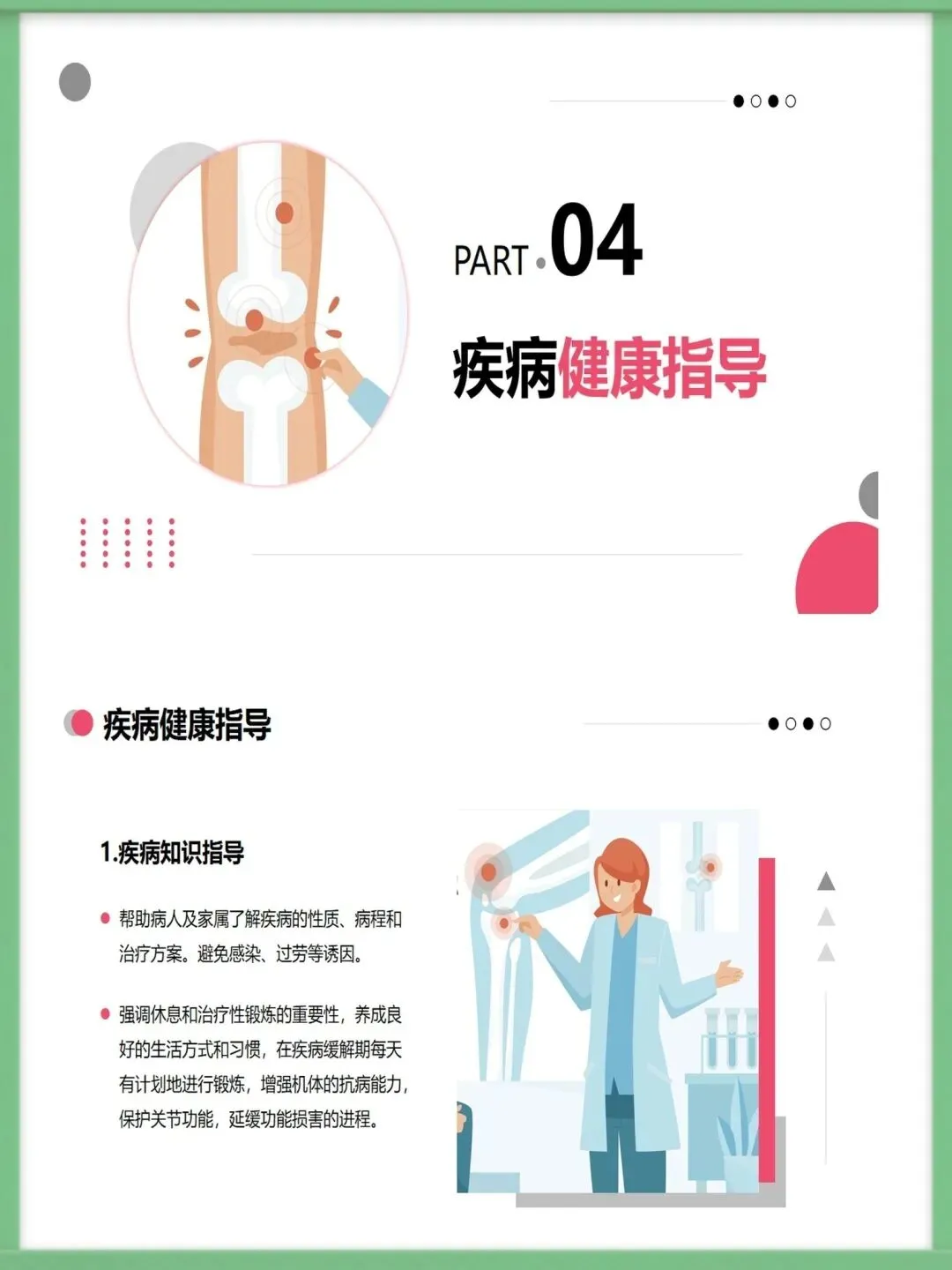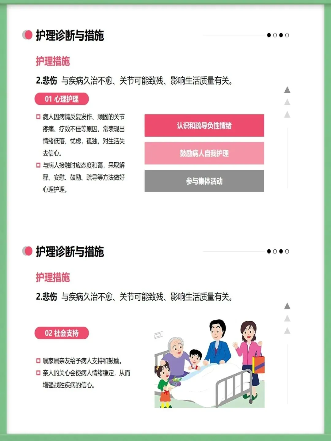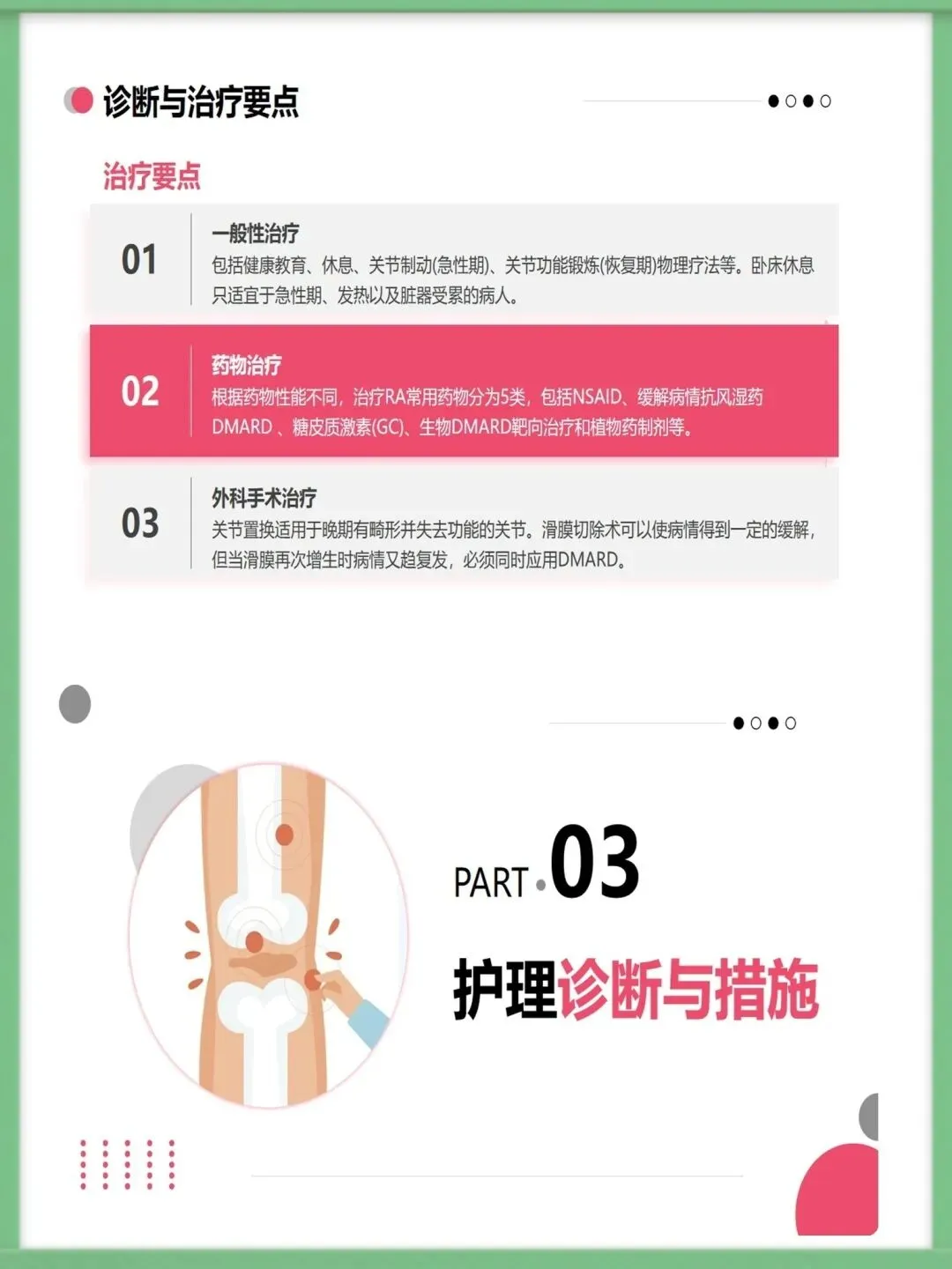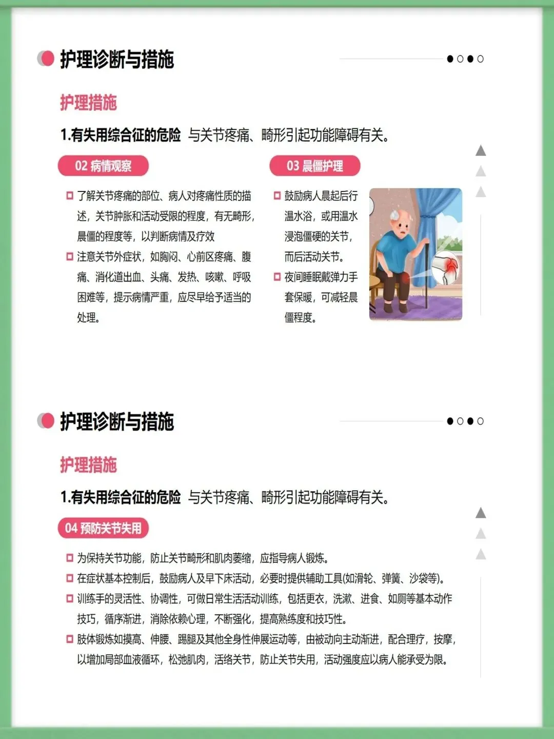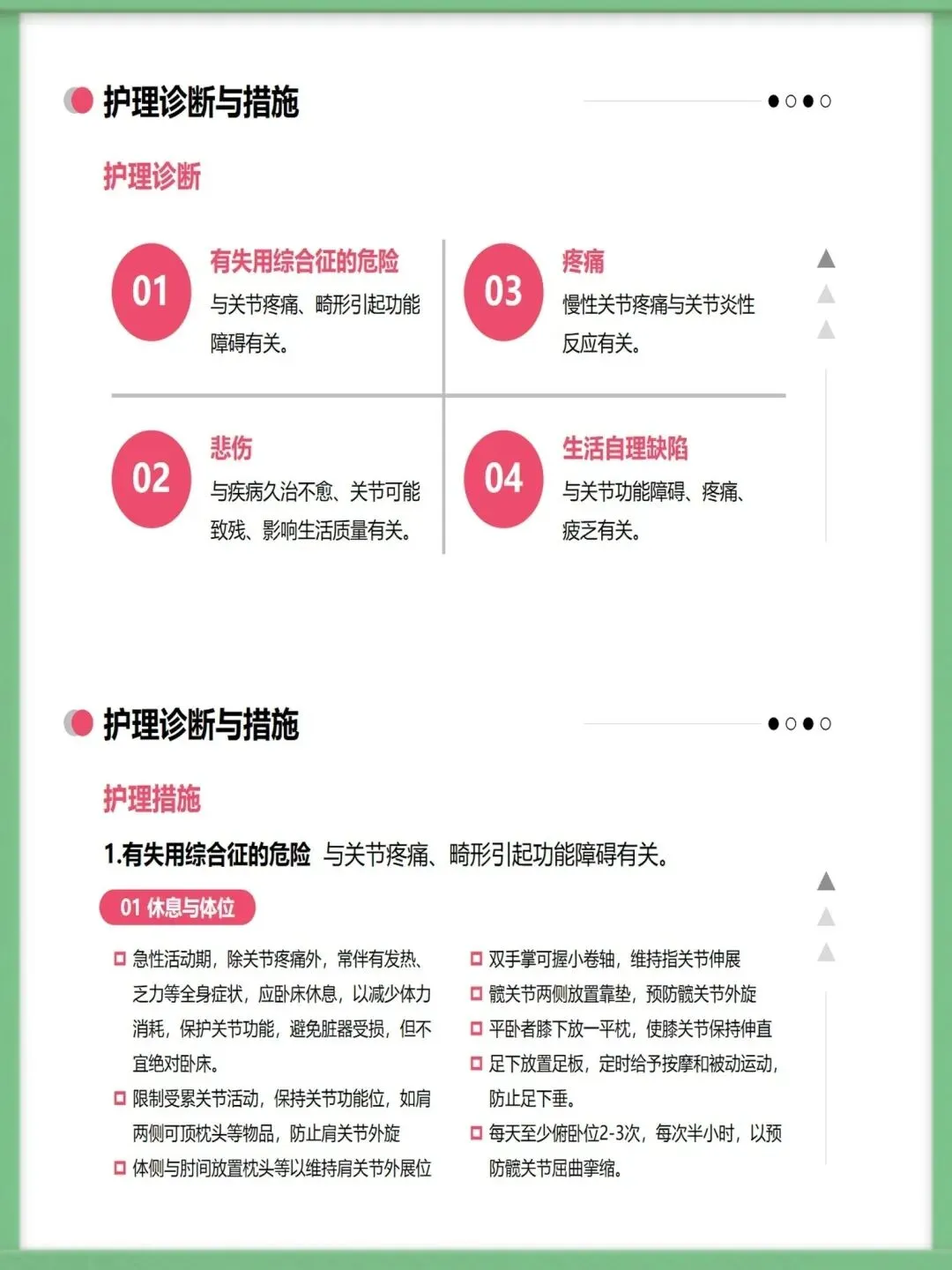 面对这样的挑战,科学的护理至关重要。我们的护理工作,核心在于“防”与“护”的结合。“防”,是预防关节功能丧失,通过急性期的休息、正确的体位摆放,以及缓解期循序渐进的康复锻炼,来最大限度保护关节功能。