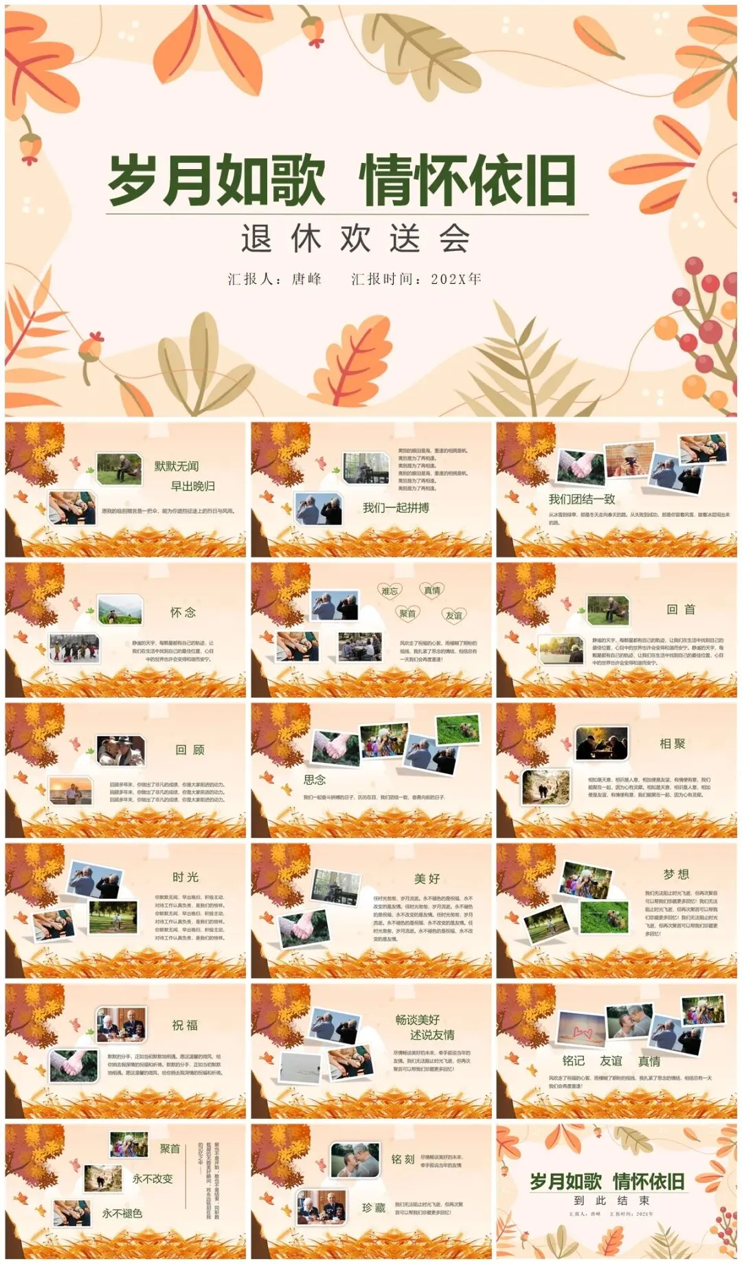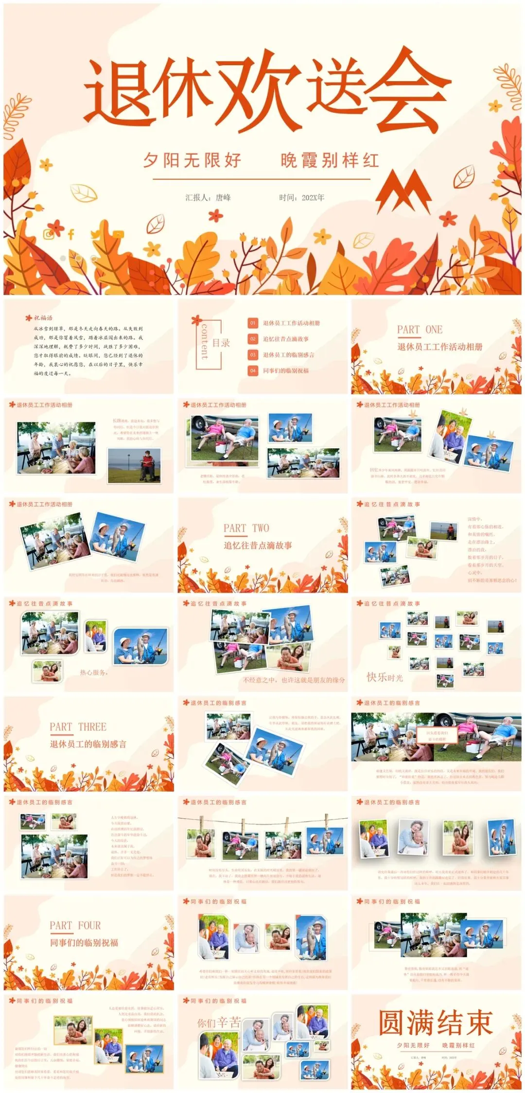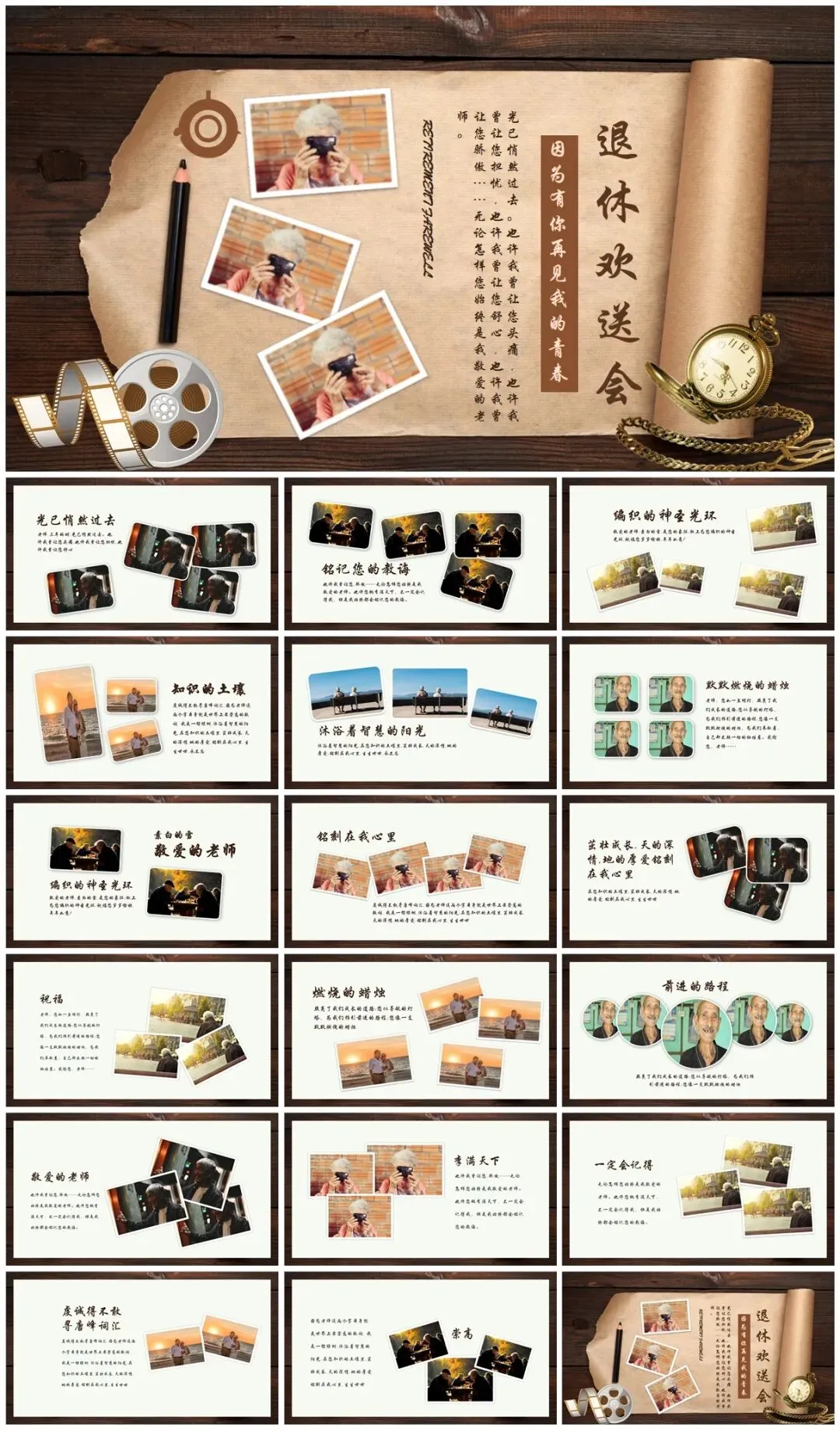 二、播放精心制作的PPT,这将是回忆的重头戏,从初入公司的青涩模样,到经验丰富的沉稳姿态,照片与视频交织,串联起他在职的点点滴滴。过往参与的重要项目、获得的荣誉、与同事的欢乐团建,都将一一呈现。