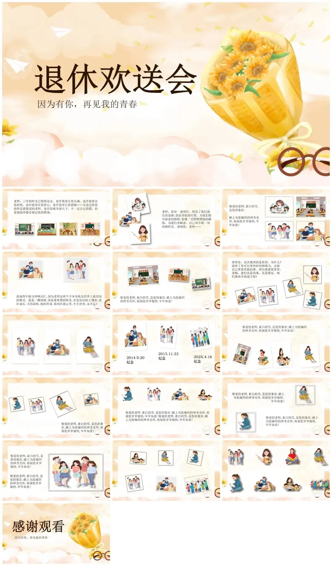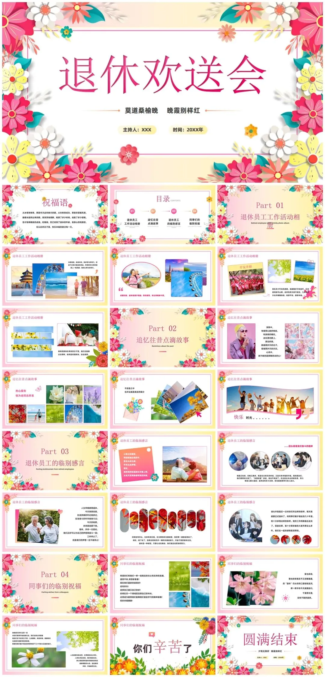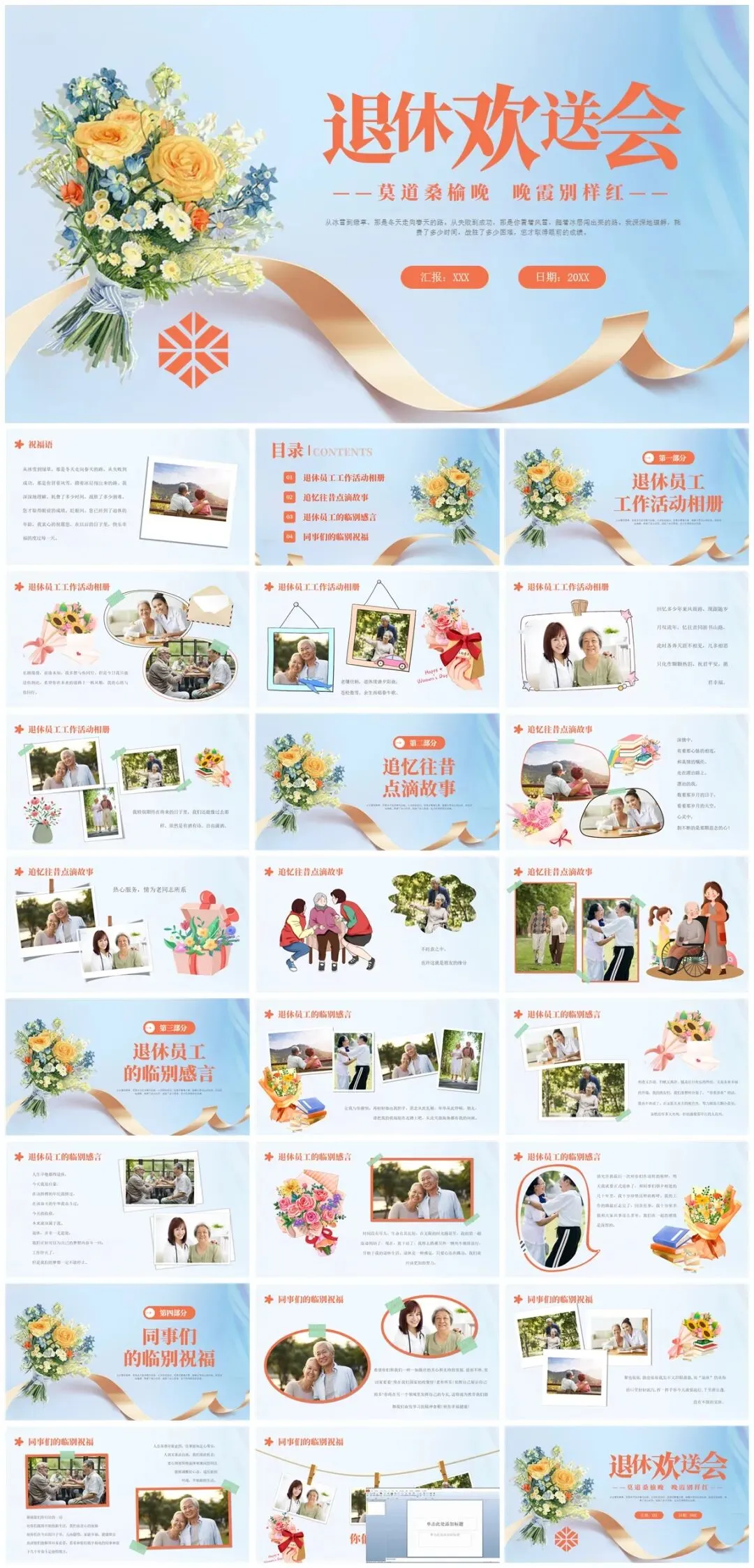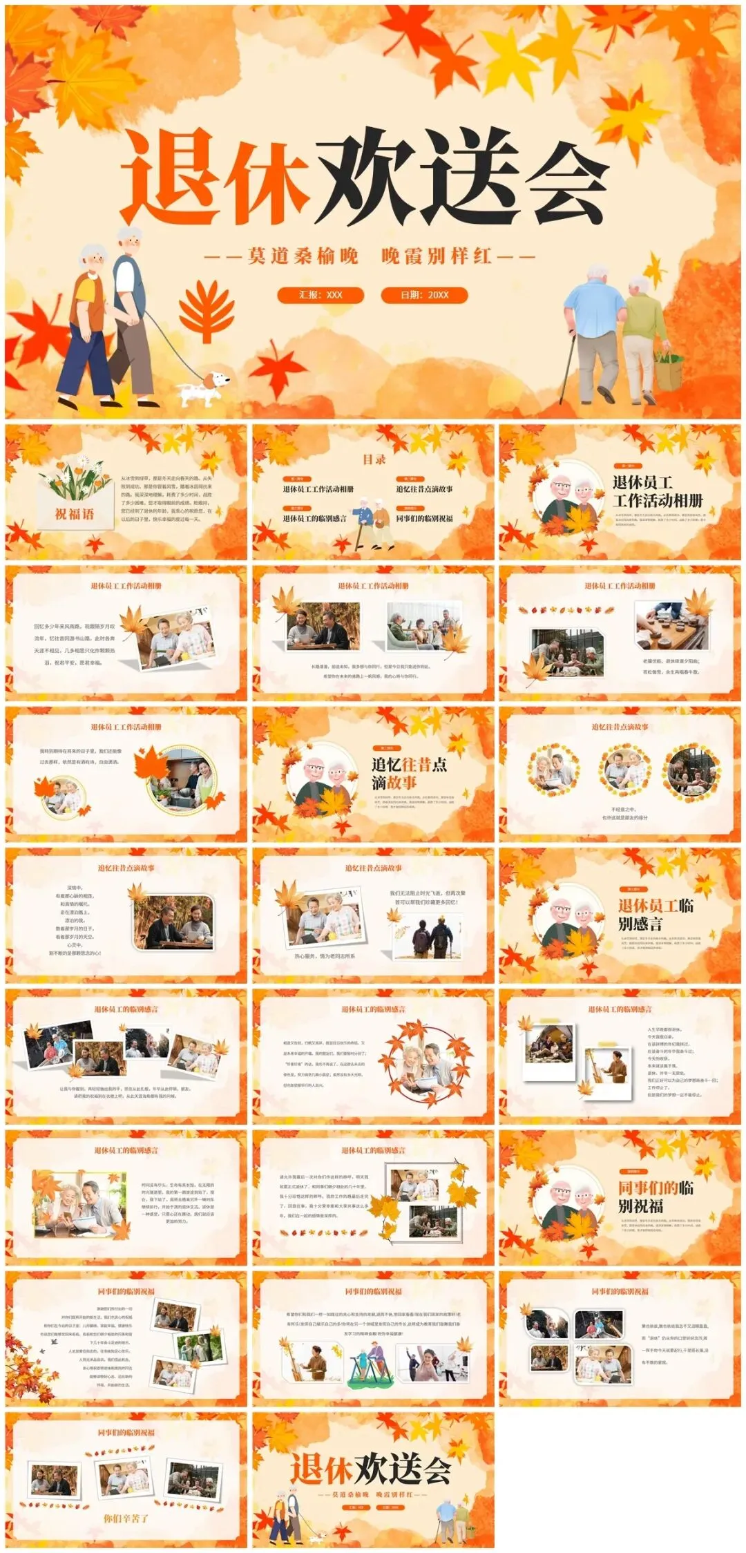 二、播放精心制作的PPT,这将是回忆的重头戏,从初入公司的青涩模样,到经验丰富的沉稳姿态,照片与视频交织,串联起他在职的点点滴滴。过往参与的重要项目、获得的荣誉、与同事的欢乐团建,都将一一呈现。