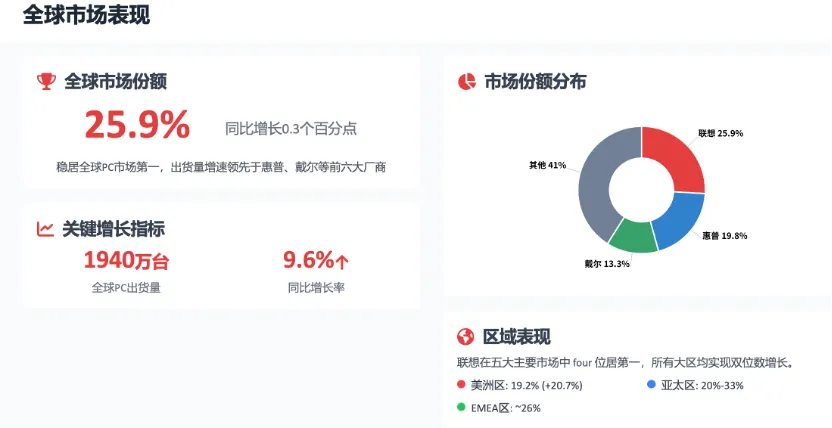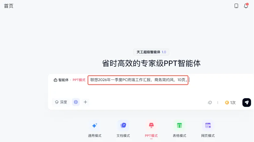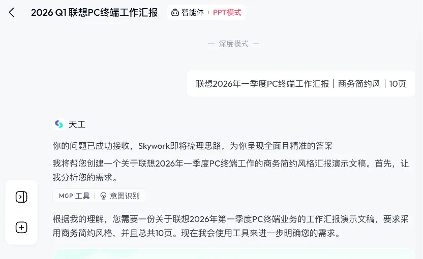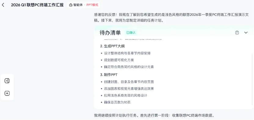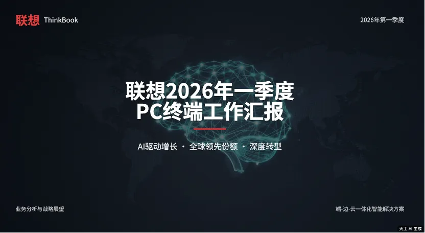 输入主题、用途、风格、页数(如:“联想2026年一季度PC终端工作汇报,商务简约风,10页”),AI自动生成封面、目录、内容页、数据图表、总结页,逻辑完整,无需手动搭框。2. 商务风超标准,直接拿去汇报