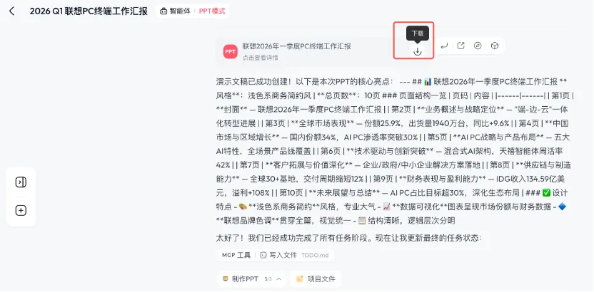 参考上面实操案例,输入:联想2026年一季度PC终端工作汇报,商务简约风,10页。系统还会进一步提示你有无补充信息,如页数可以调整,选择“生成的页面风格”,或者你也可以选择“AI自动规划决策”,让AI自动执行即可。在生成的过程中你可以针对部分内容进行修改,也可以全程不参与,让AI自动决策,完成PPT的制作。任务执行的非常快,大约5~8分钟就生成了一个10页的专业PPT文件。格式支持PPTX、PDF或HTML,免费用户也能有20次免费下载的福利,可谓最慷慨的PPT生成AI工具了。如果公司用,可以办理会员,体验更好了。你看,AI生成PPT真的是零基础、零难度,任何人都能快速上手。适合谁用?