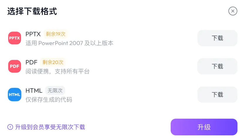 全程操作不到10分钟,支持导出PPTX/PDF/HTML格式,免费用户可下载20次,生成内容可随意修改,水印可手动去除,真正“拿来即用”。小白上手五步曲