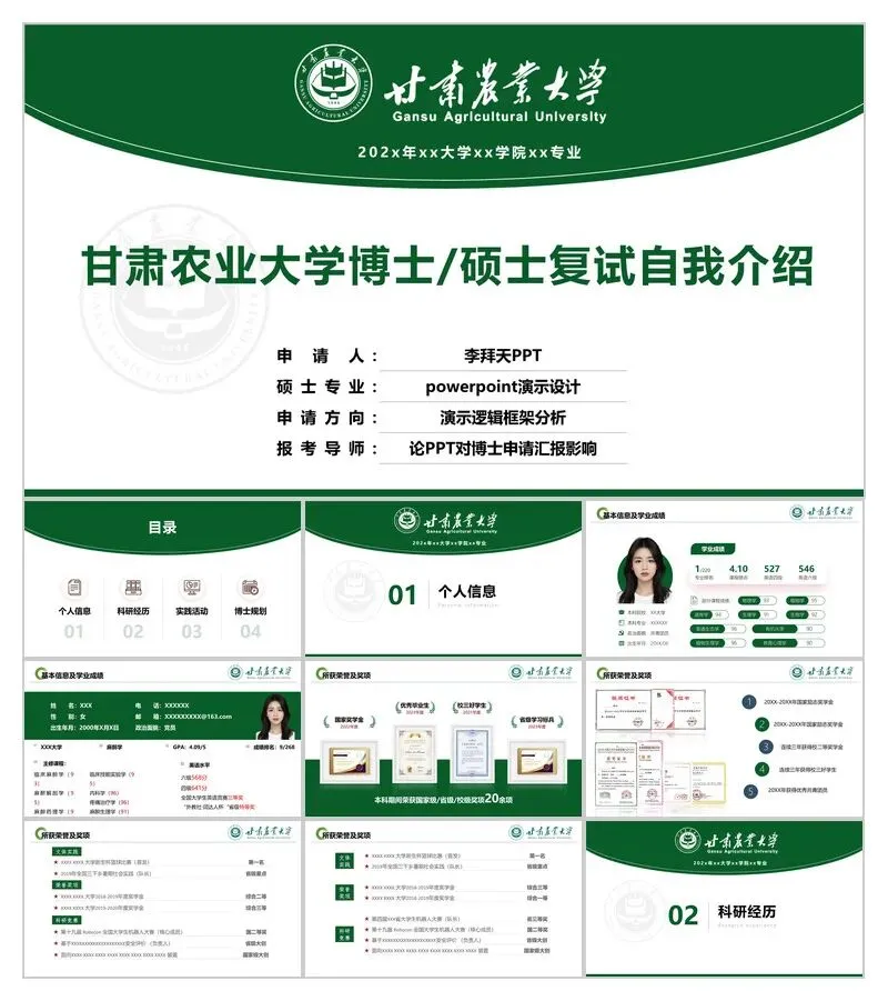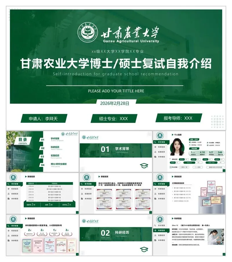 今天给大家整理了 4套甘农大专属PPT模板,全部采用学校官方绿色系,适配复试自我介绍、博士申请汇报等场景,结构清晰、细节拉满,直接替换内容就能用!