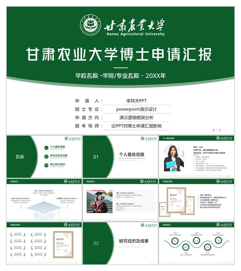 这套模板以甘农大校园实景为背景,整体视觉现代大气,适合突出个人学术背景、科研经历和实践成果。