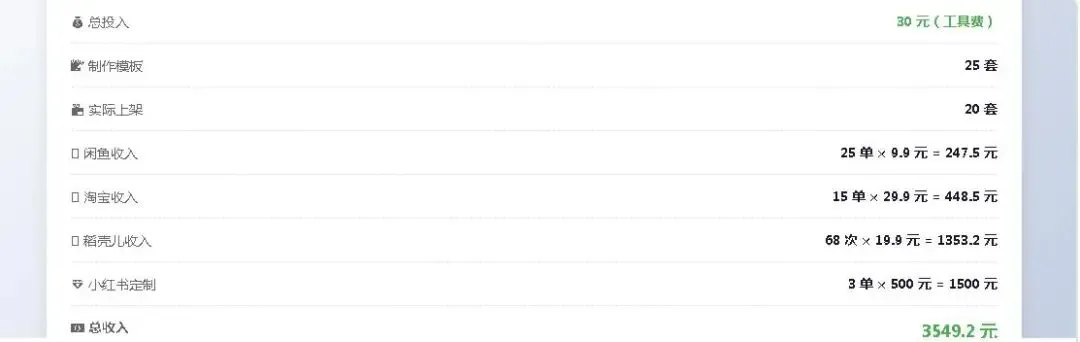 **产出**:制作模板 25 套,上架 20 套,售出 46 单,收入 2300 元