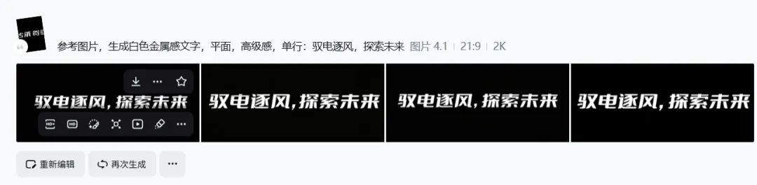 图片铺满页面后,接下来要做封面的核心文字,用 AI 生成白色金属感的标题文字,关键词直接定“驭电逐风,探索未来”,贴合超跑的科技感和速度感,让文字和画面质感匹配 ↓