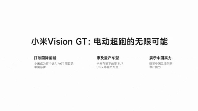 尤其是小米 VGT,1秒级零百加速、1300匹马力、0.29Cd超低风阻👇