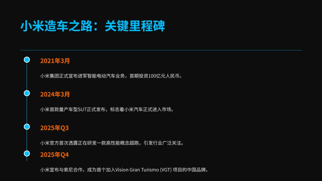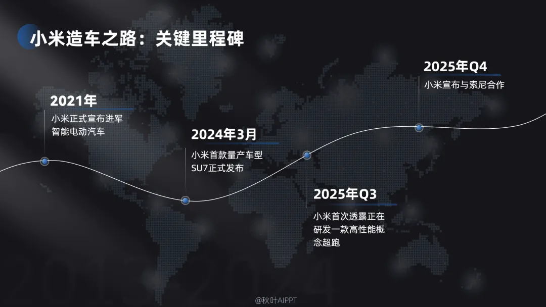 再加上 “小米造车之路:关键里程碑” 的主标题,完善整体版式。