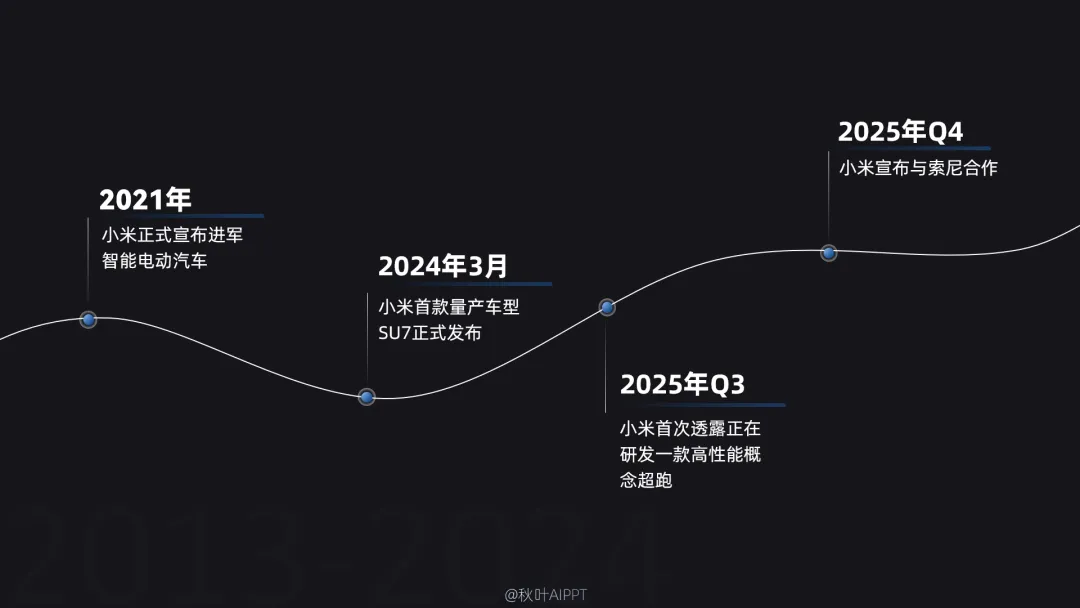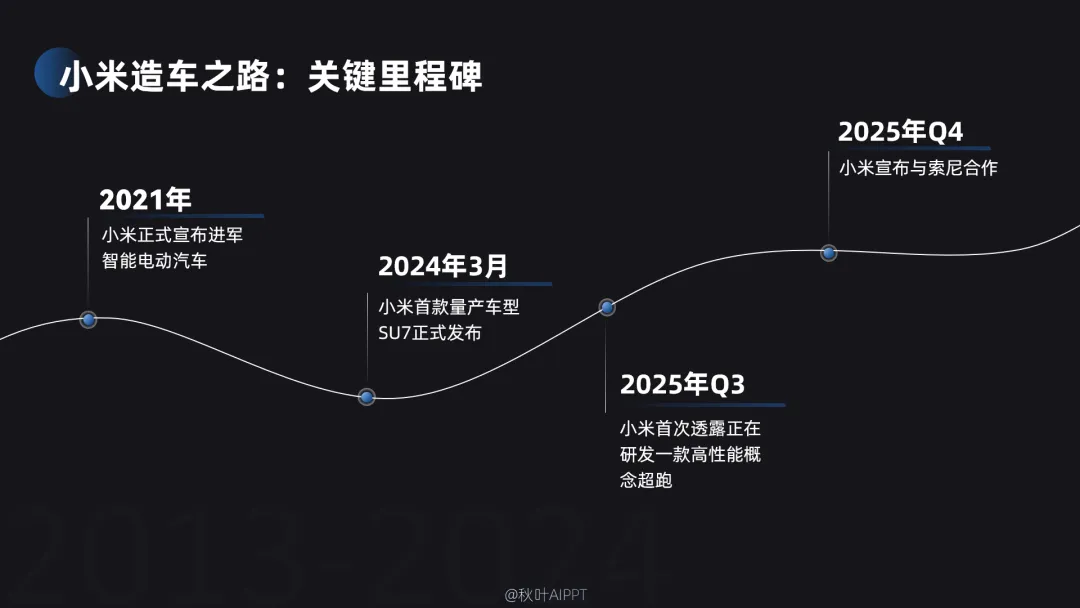 然后把小米造车的关键节点文字填进去,从进军智能电动汽车到发布 SU7,再到研发超跑、与索尼合作,按时间顺序清晰排布 ↓