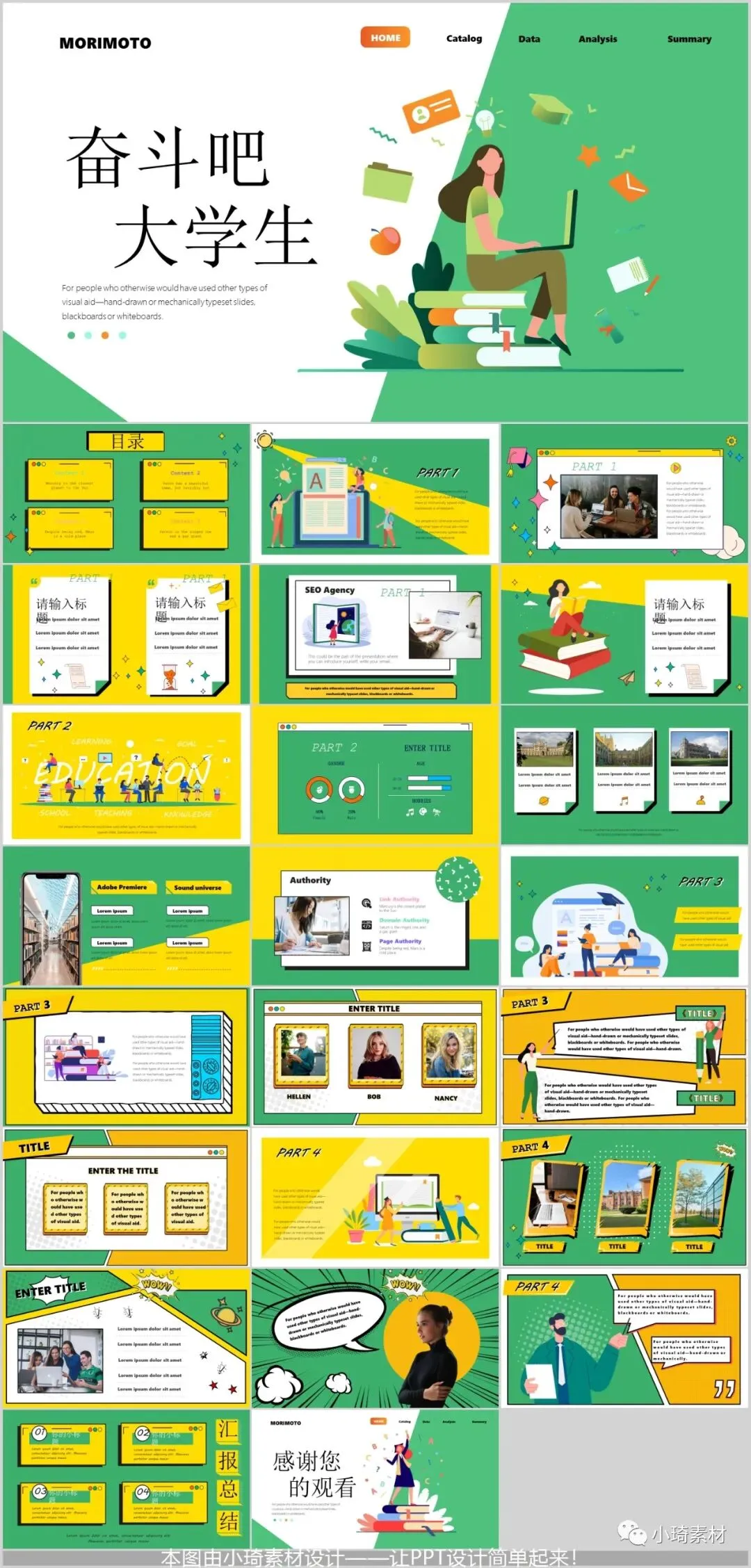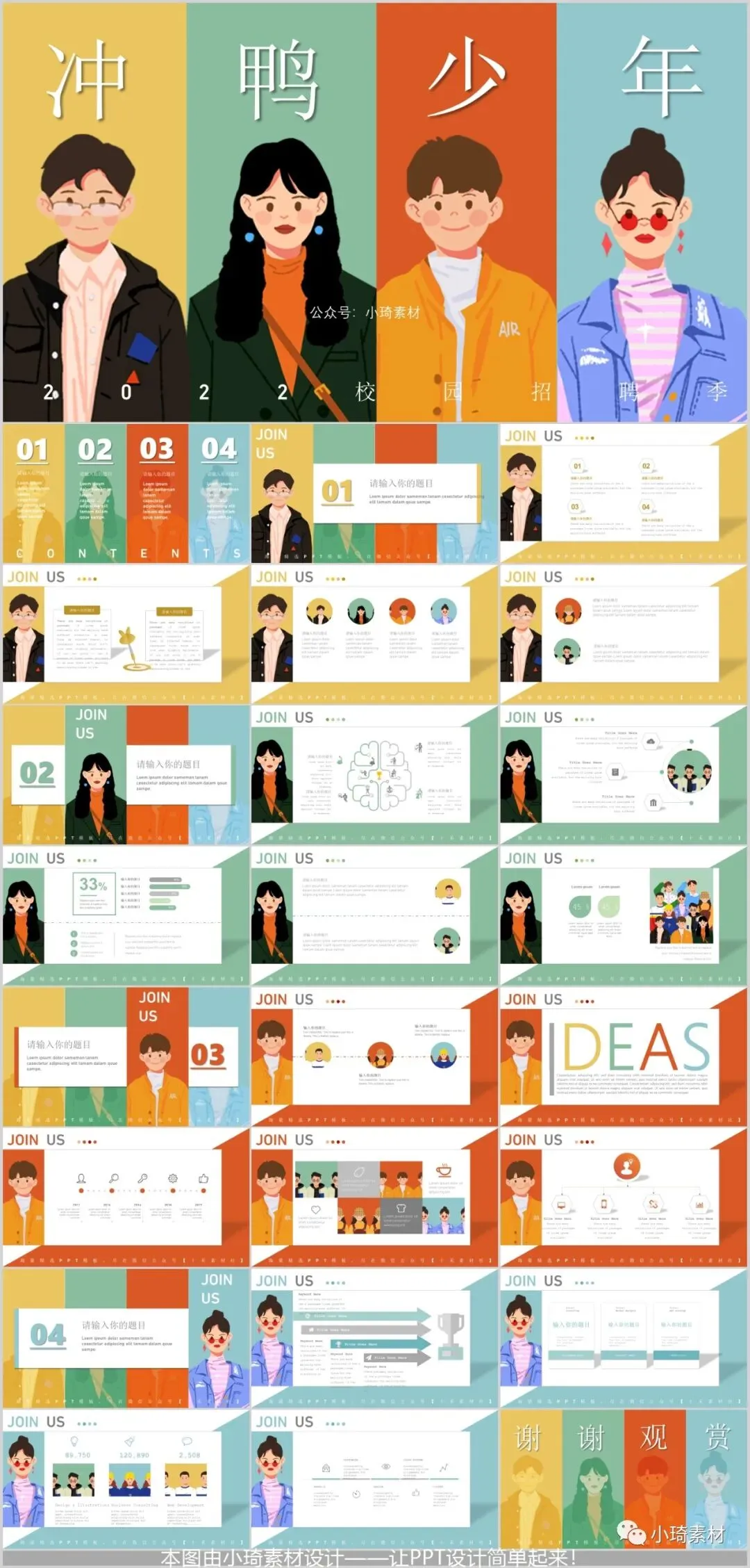 明艳的配色,生气蓬勃的排版, 无论是在做招聘还是在做授课,又或者是假期记录、大学生学习规划或者是团队介绍都挑合适了!