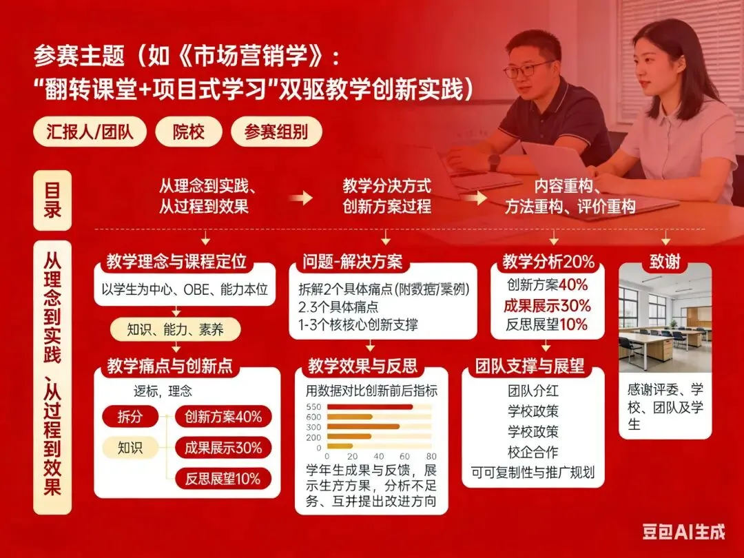 Tips:模块配比要合理,建议教学分析占20%、创新方案占40%、成果展示占30%、反思展望占10%,重点突出创新点与落地效果。