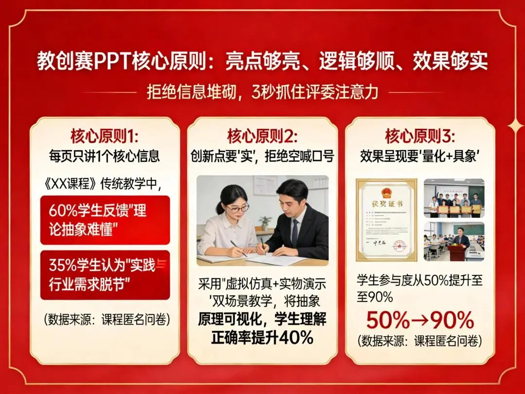 教创赛PPT不看“内容多全”,只看“亮点够亮、逻辑够顺、效果够实”。很多老师容易陷入“堆砌信息”的误区,反而让核心创新点被淹没,记住这3个核心原则: