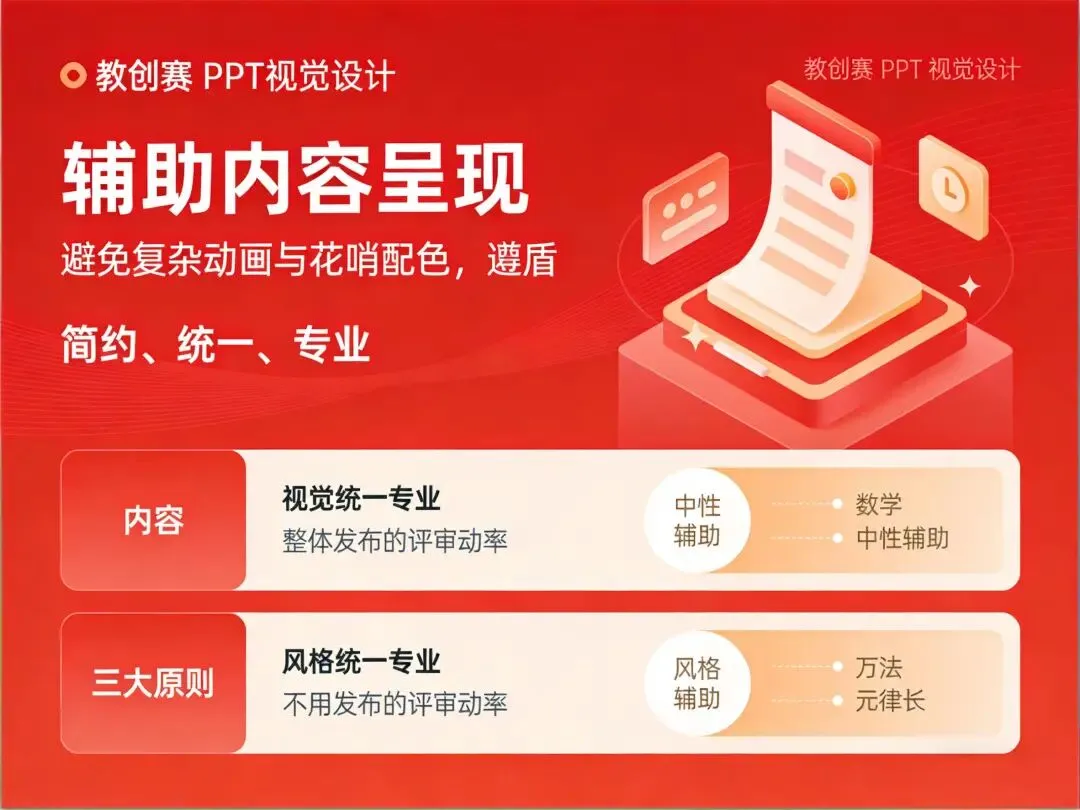 视觉设计的核心是“辅助内容呈现”,不是“炫技”。很多老师花大量时间做复杂动画、花哨配色,反而分散评委注意力,得不偿失。教创赛PPT视觉设计,遵循“简约、统一、专业”三大原则即可。