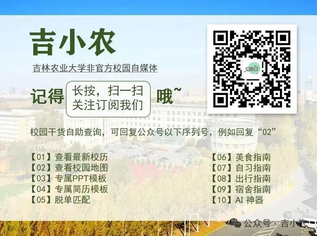 --关注微信公众号“吉小农”--吉农线上实习兼职互助群来啦!恭喜吉农国家级一流本科课程再+6!每人10000元!恭喜吉农55名学子!寒假吉农优秀学生作息安排~吉林农业大学2026保研通知恭喜吉农这130位老师上榜!