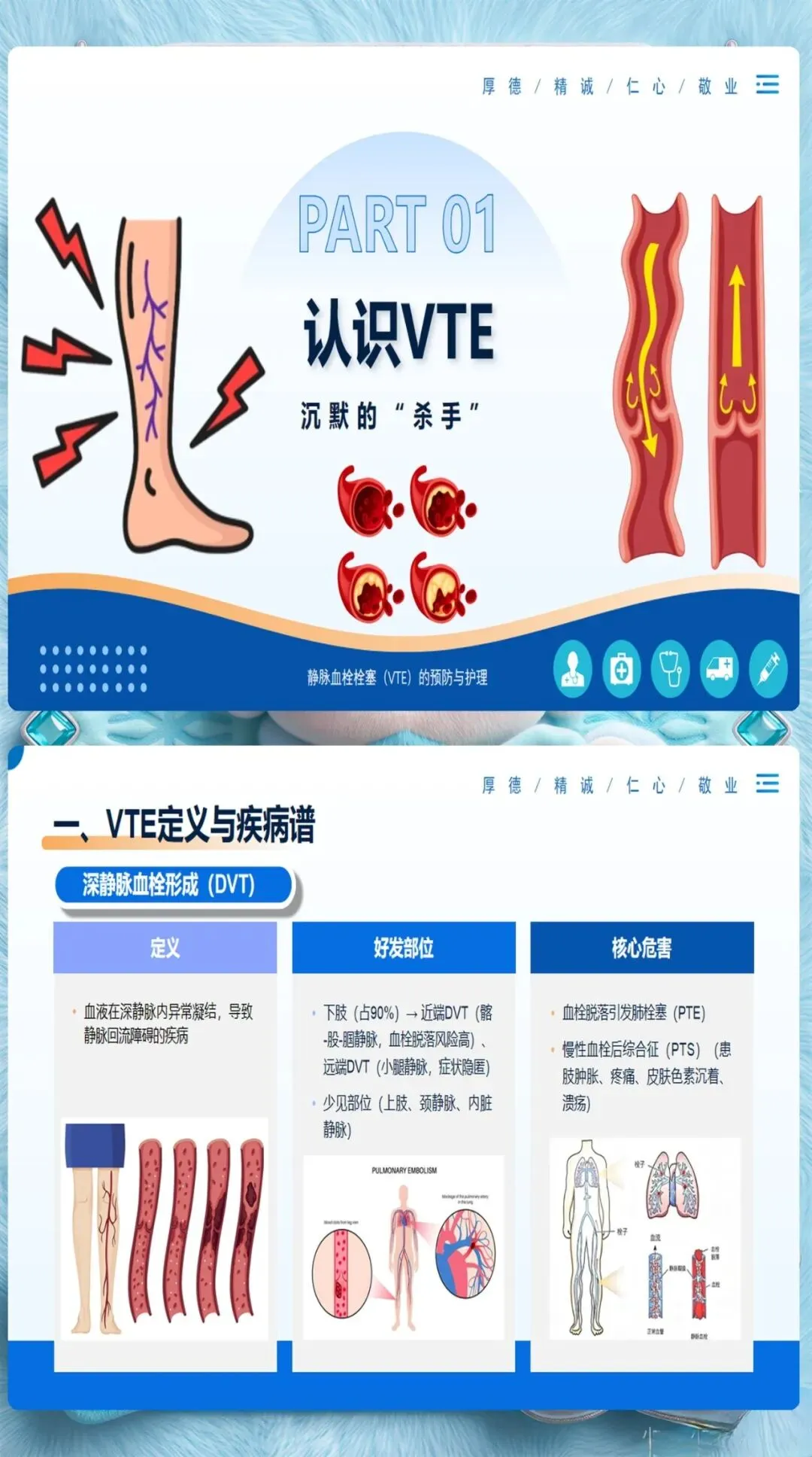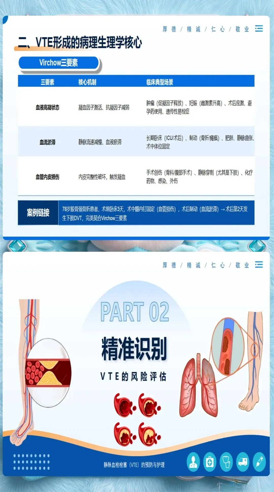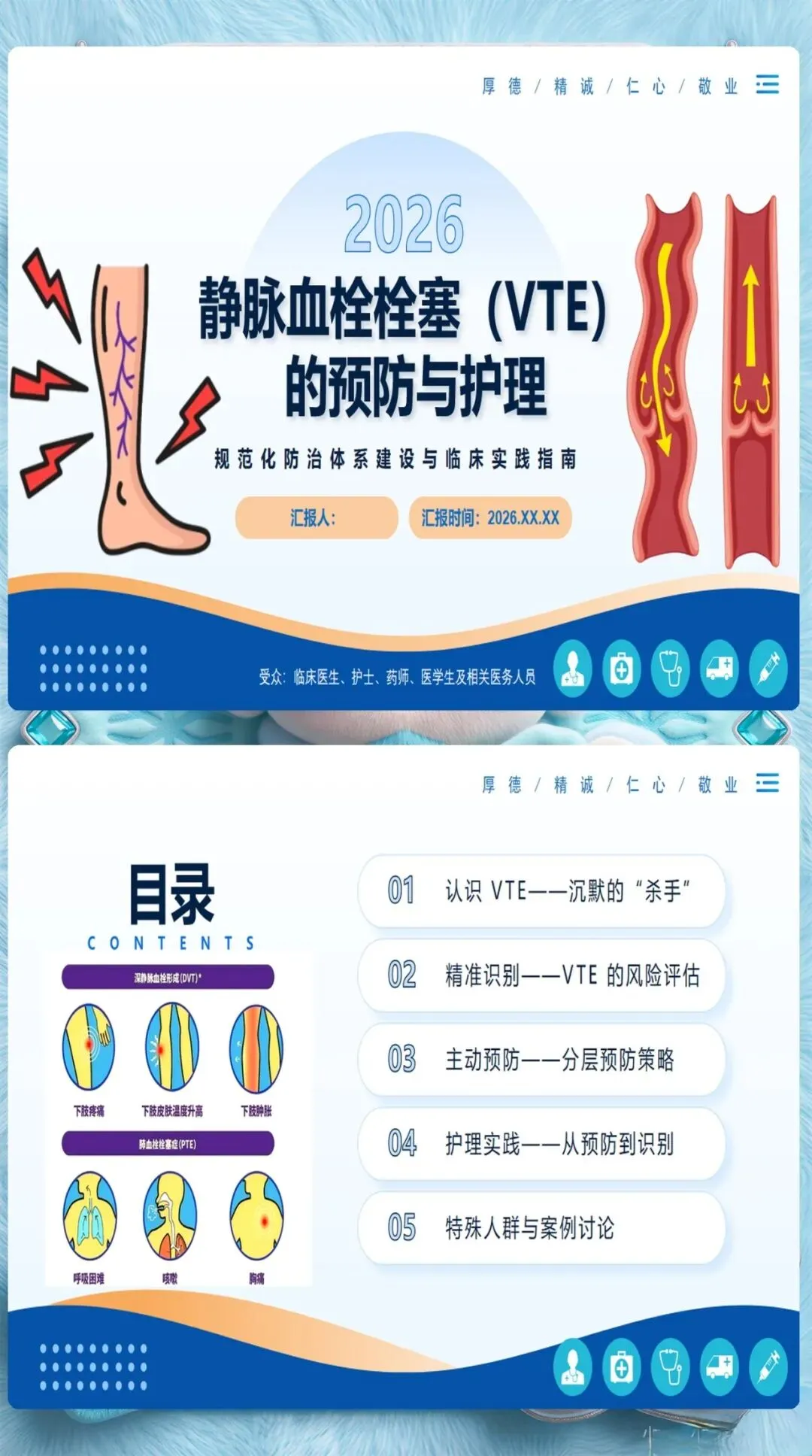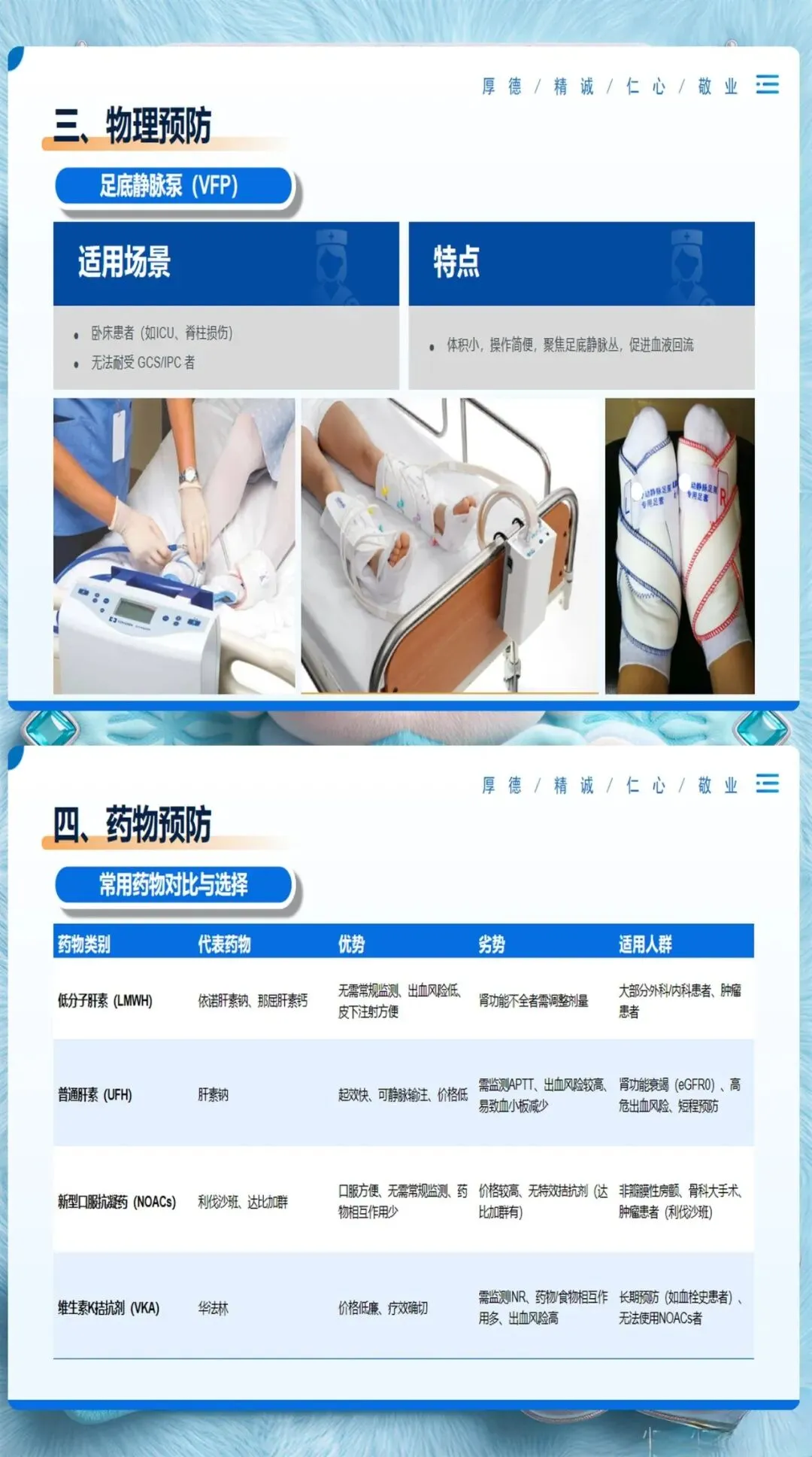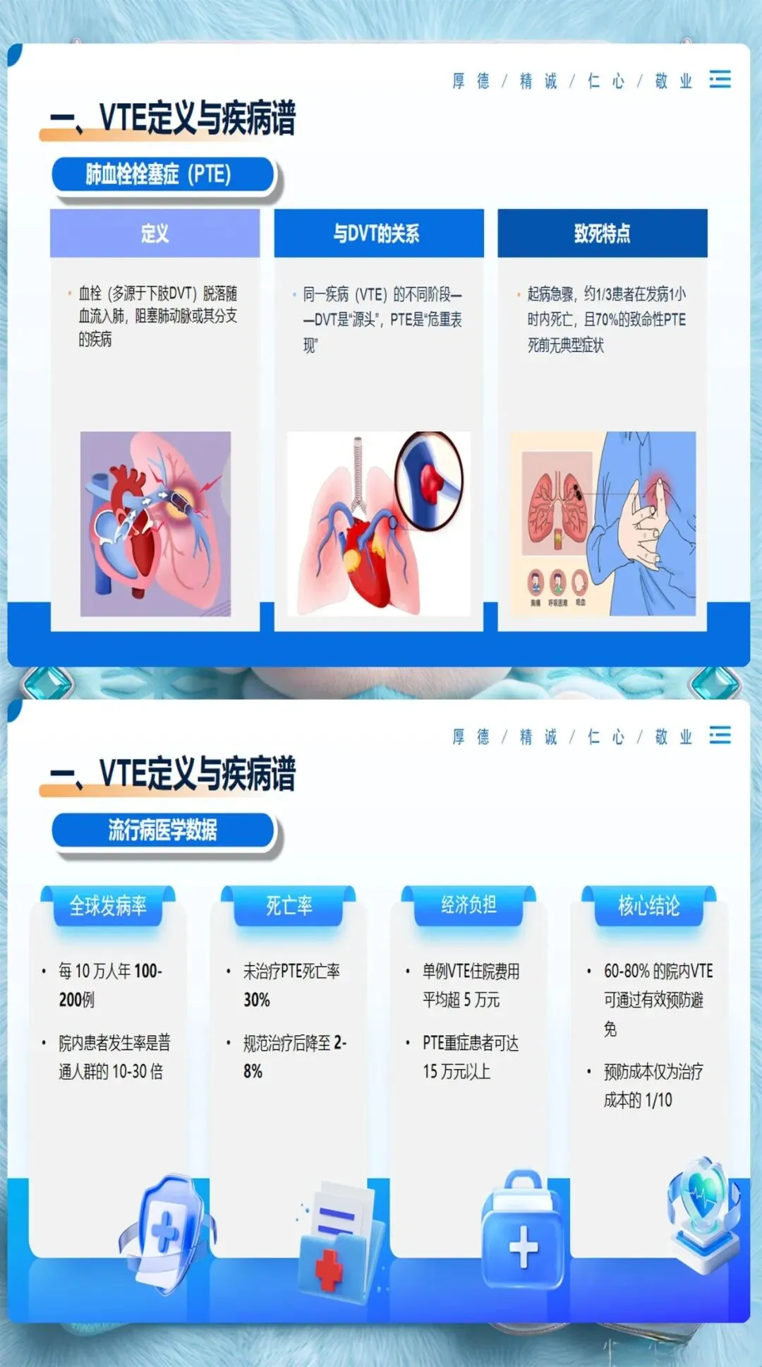 静脉血栓栓塞症的发生基于三大病理基础,即血液高凝状态、血流淤滞和血管内皮损伤,这被称为Virchow三要素。在临床实践中,我们需要认识到VTE具有高隐匿性和高致死率的特点,未治疗的肺栓塞死亡率可高达30%,而规范的预防措施可使60%至80%的院内VTE事件得到避免。院内患者发生VTE的风险是普通人群的10到30倍,因此建立系统化的防治体系显得尤为重要。