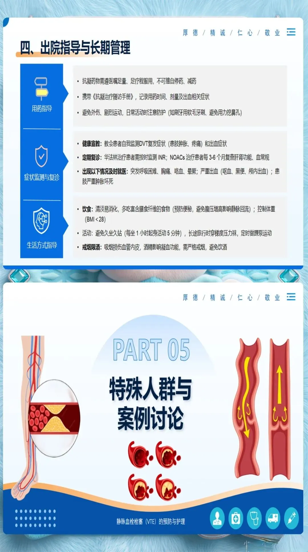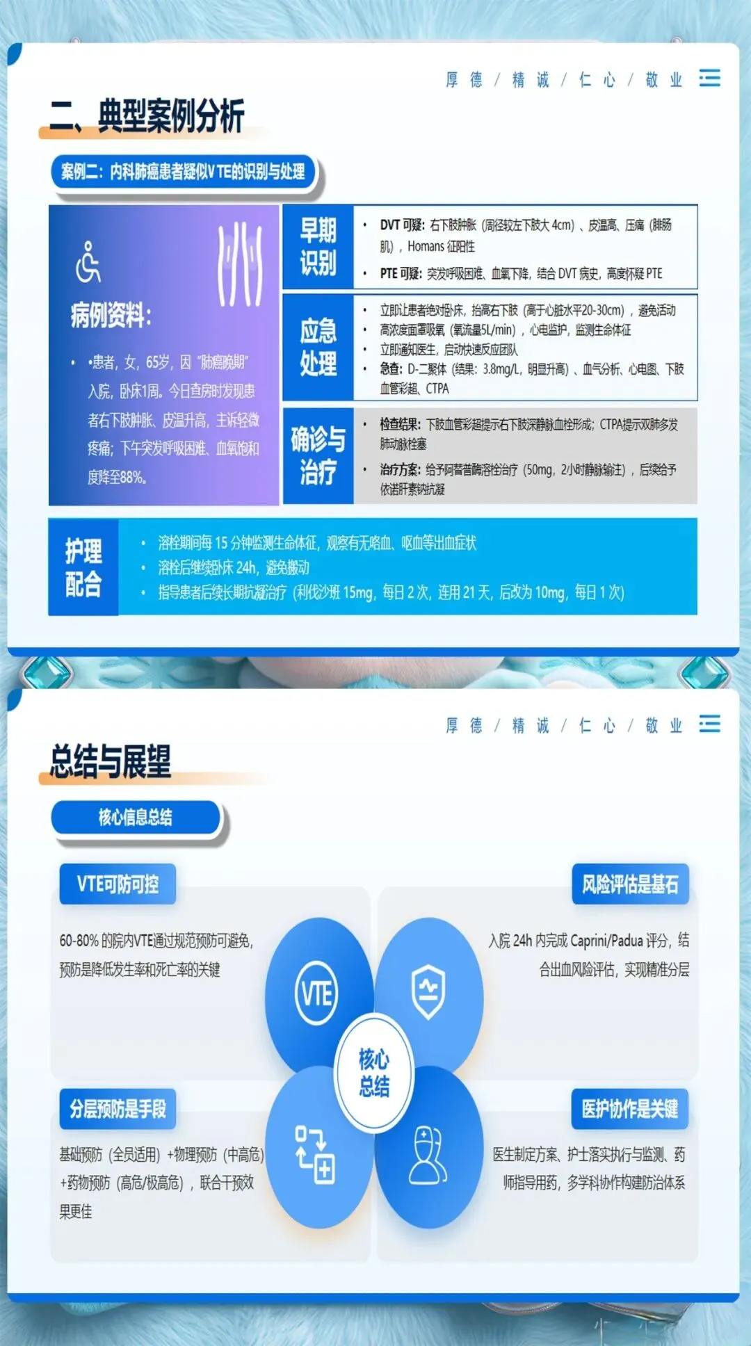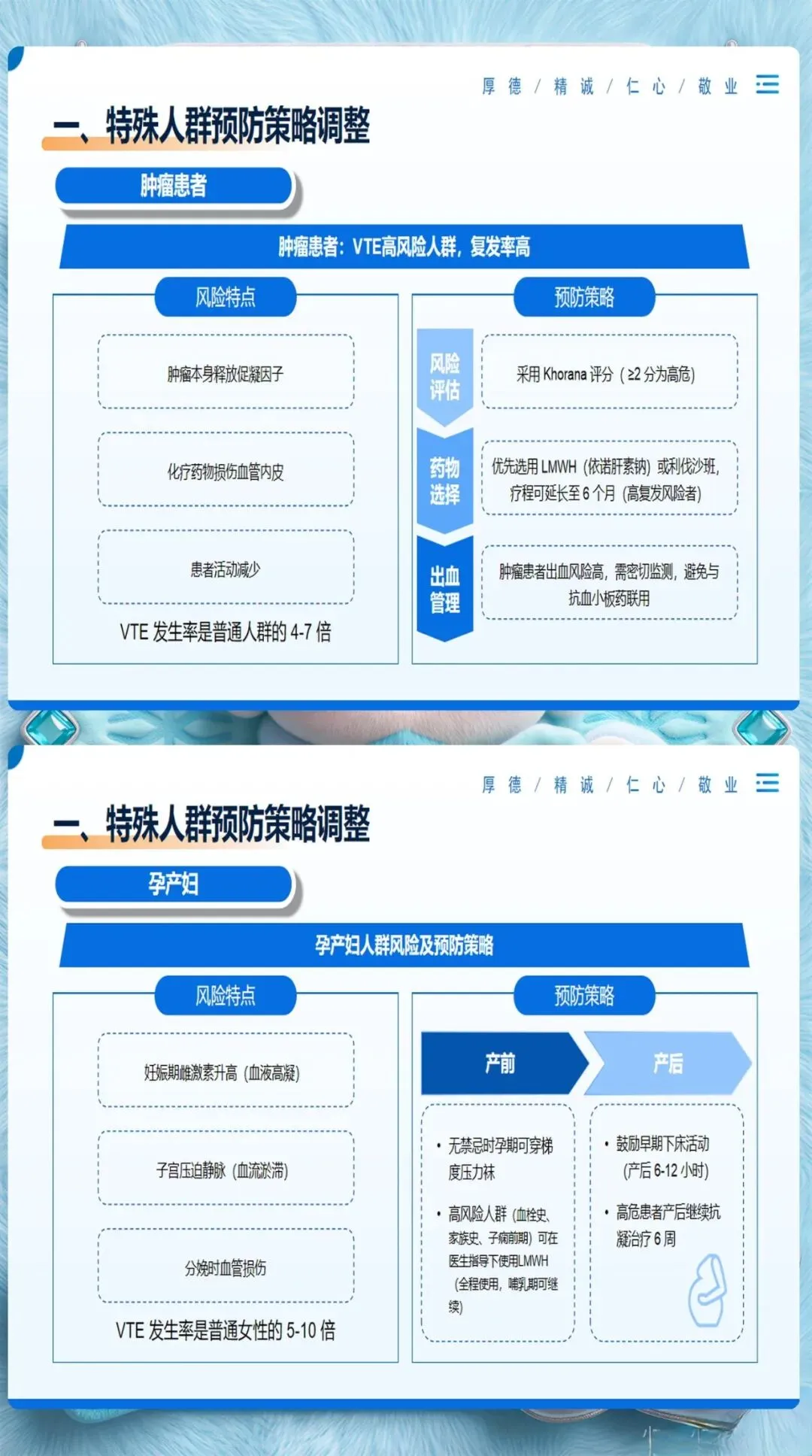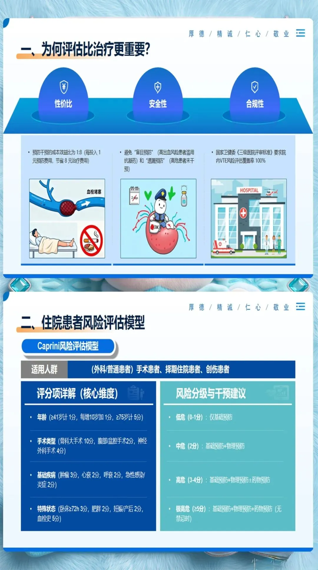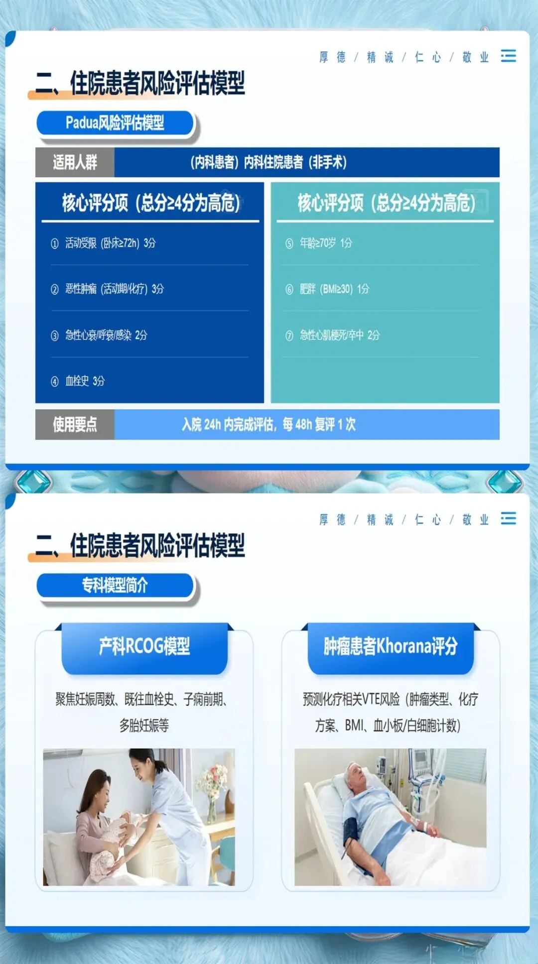 风险评估是VTE防治的首要环节,需要贯穿患者住院全周期。在临床工作中,我们应当建立标准化的风险评估流程,采用经过验证的评估工具,结合患者个体特征进行动态调整。