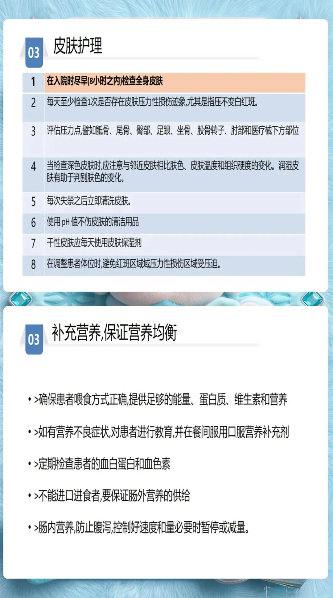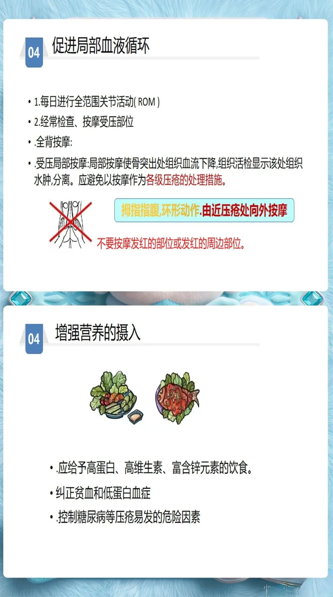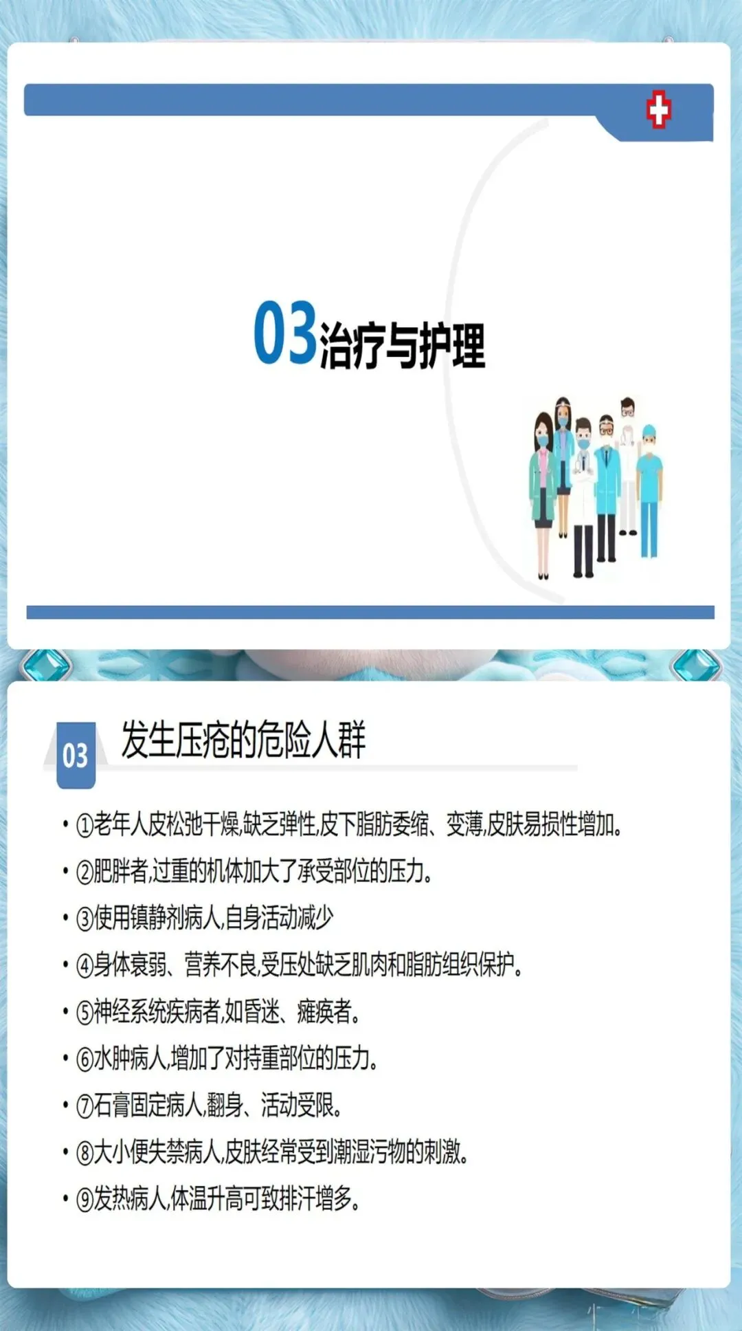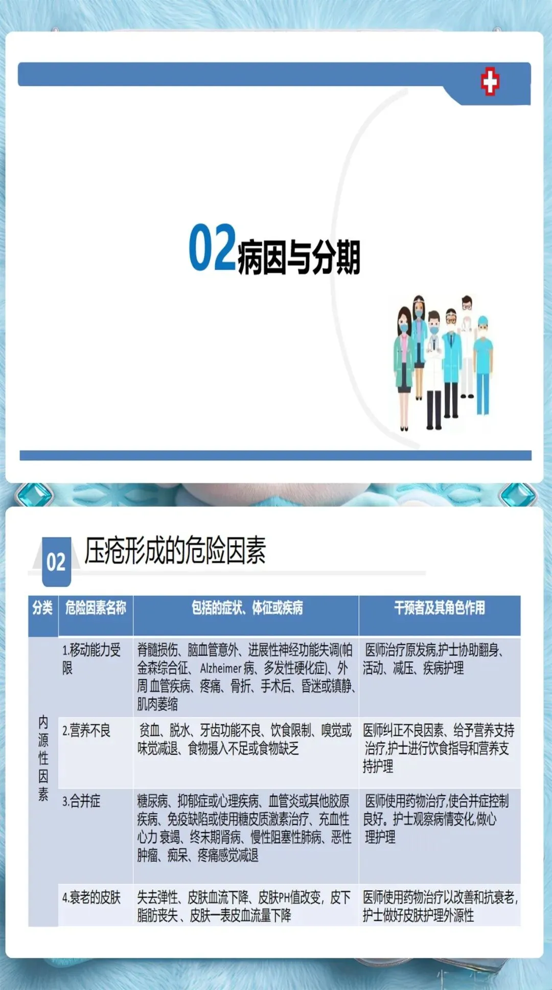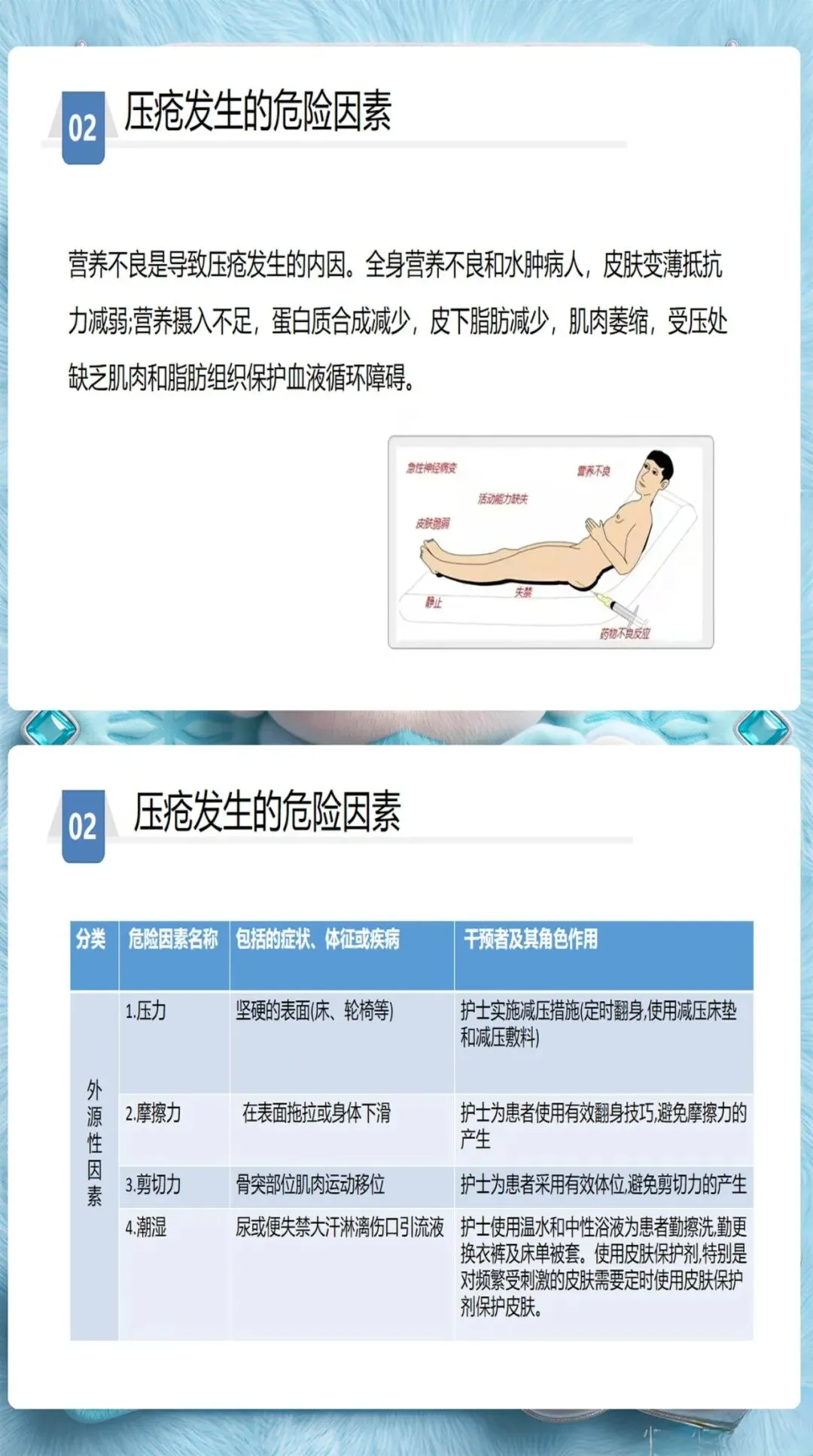除了Braden量表的6个维度(感知能力、潮湿程度、活动能力、移动能力、营养摄入、摩擦力和剪切力),护士还需要关注这些容易被忽视的风险因素:糖尿病、低蛋白血症、使用镇静剂、年龄超过70岁、大手术后48小时内。