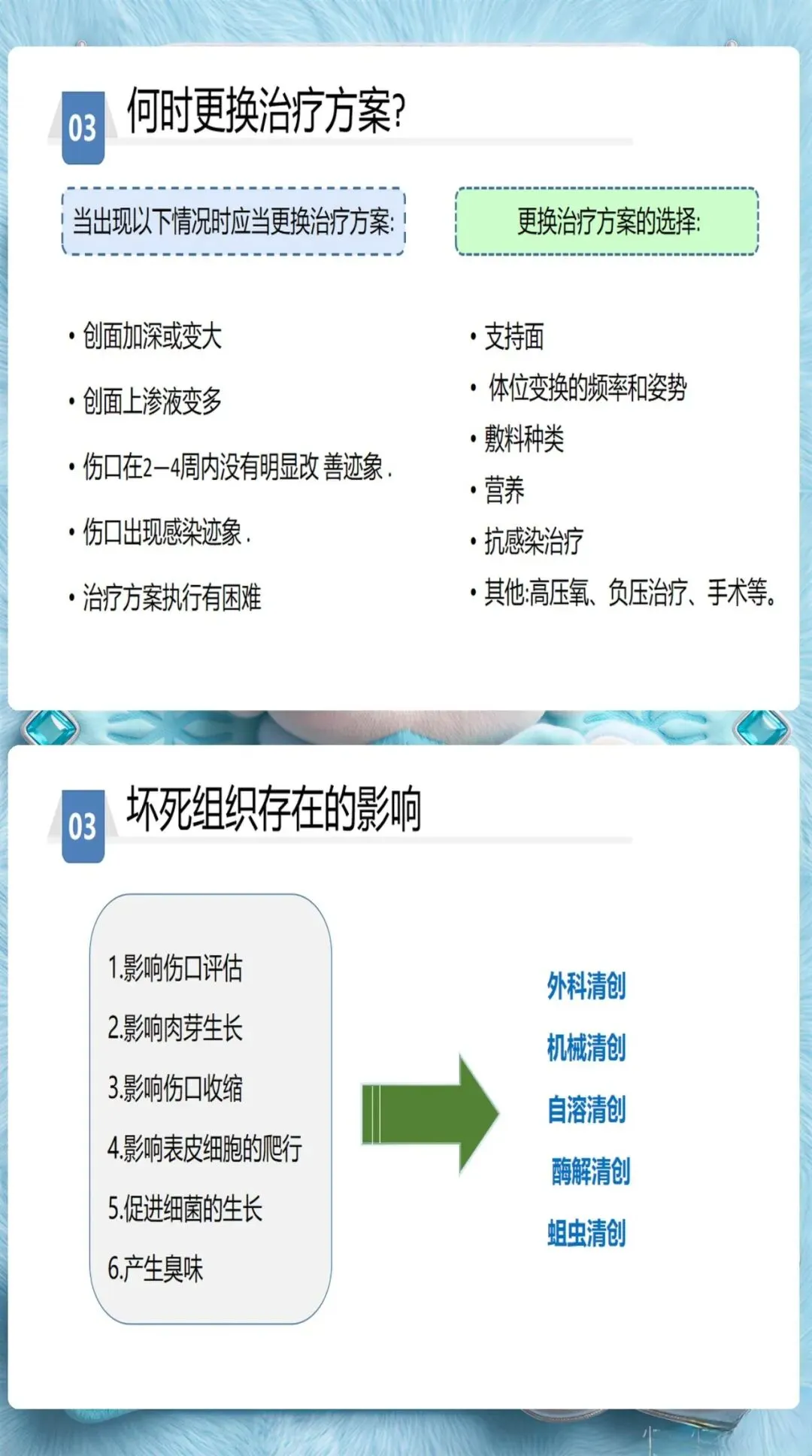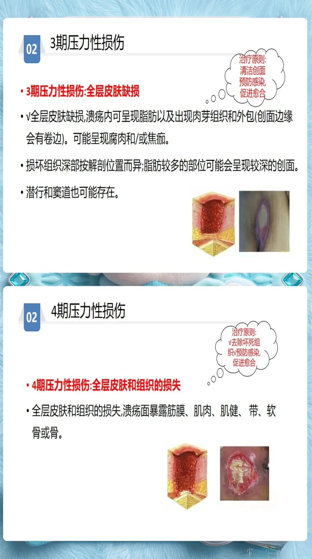 3级和4级: 全层皮肤和组织缺失,可能涉及肌肉、骨骼。需要专科护士介入,制定个体化伤口护理方案。