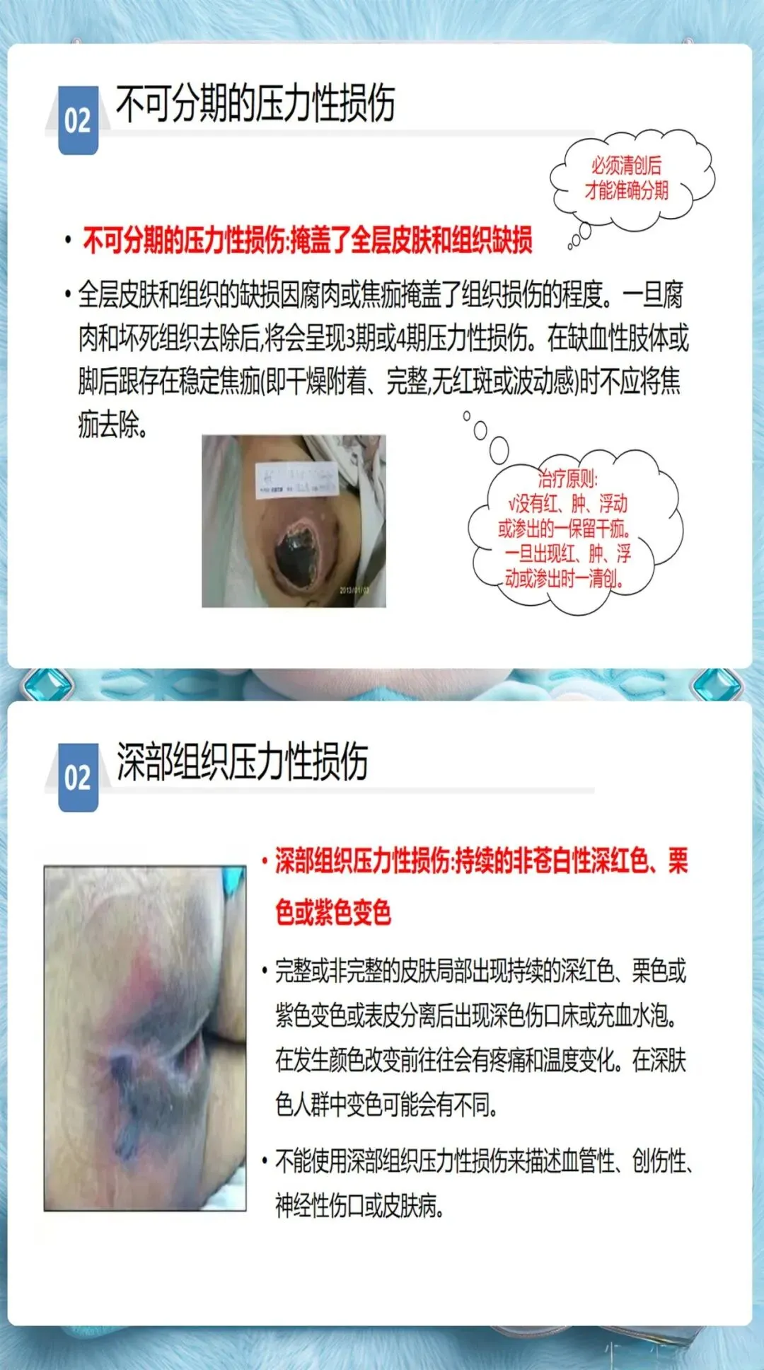 深部组织损伤(DTI)和医疗器械相关压力损伤(MDRPI)是容易被忽视的类型。DTI早期表现为紫色或栗色斑块,需要高度警惕,及时减压并密切监测。MDRPI则常见于氧气管、气管插管固定处,这类损伤往往被误认为是器械摩擦导致的擦伤,但本质上仍然是压力性损伤,需要按照规范处理。、