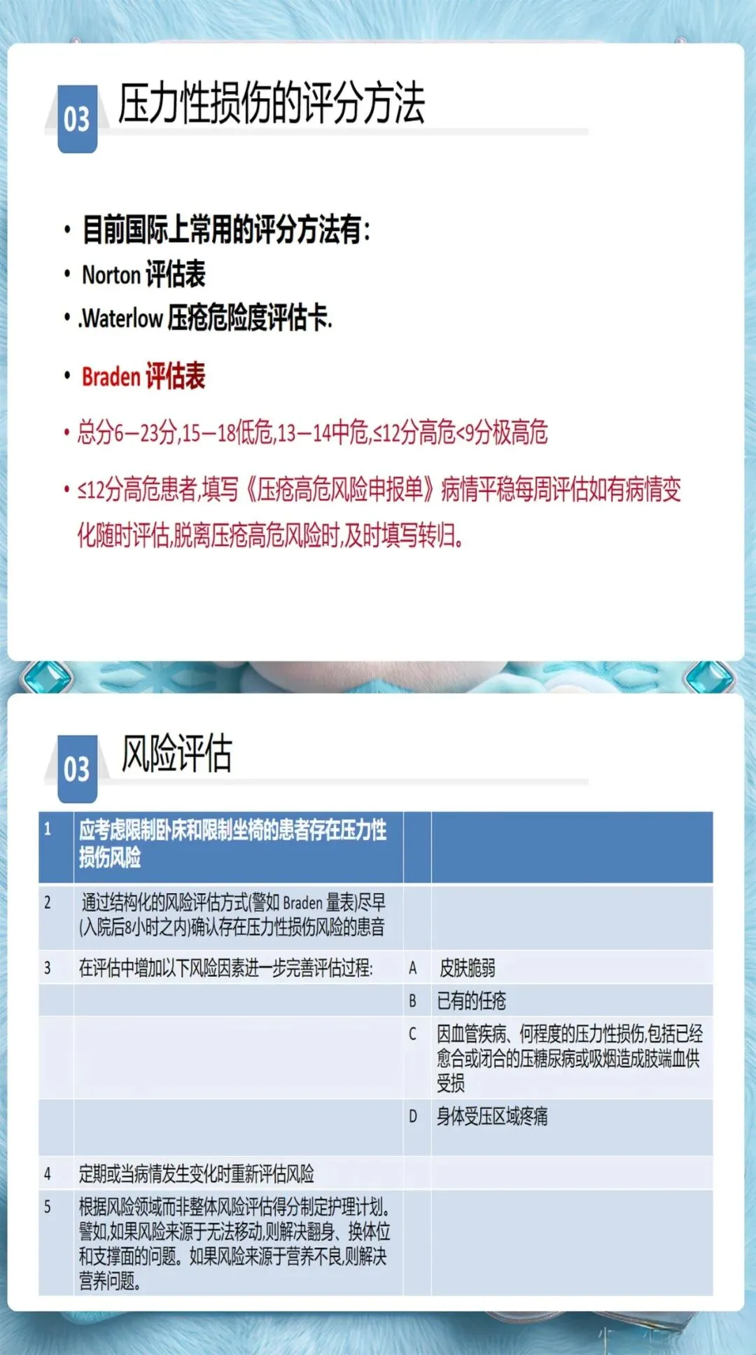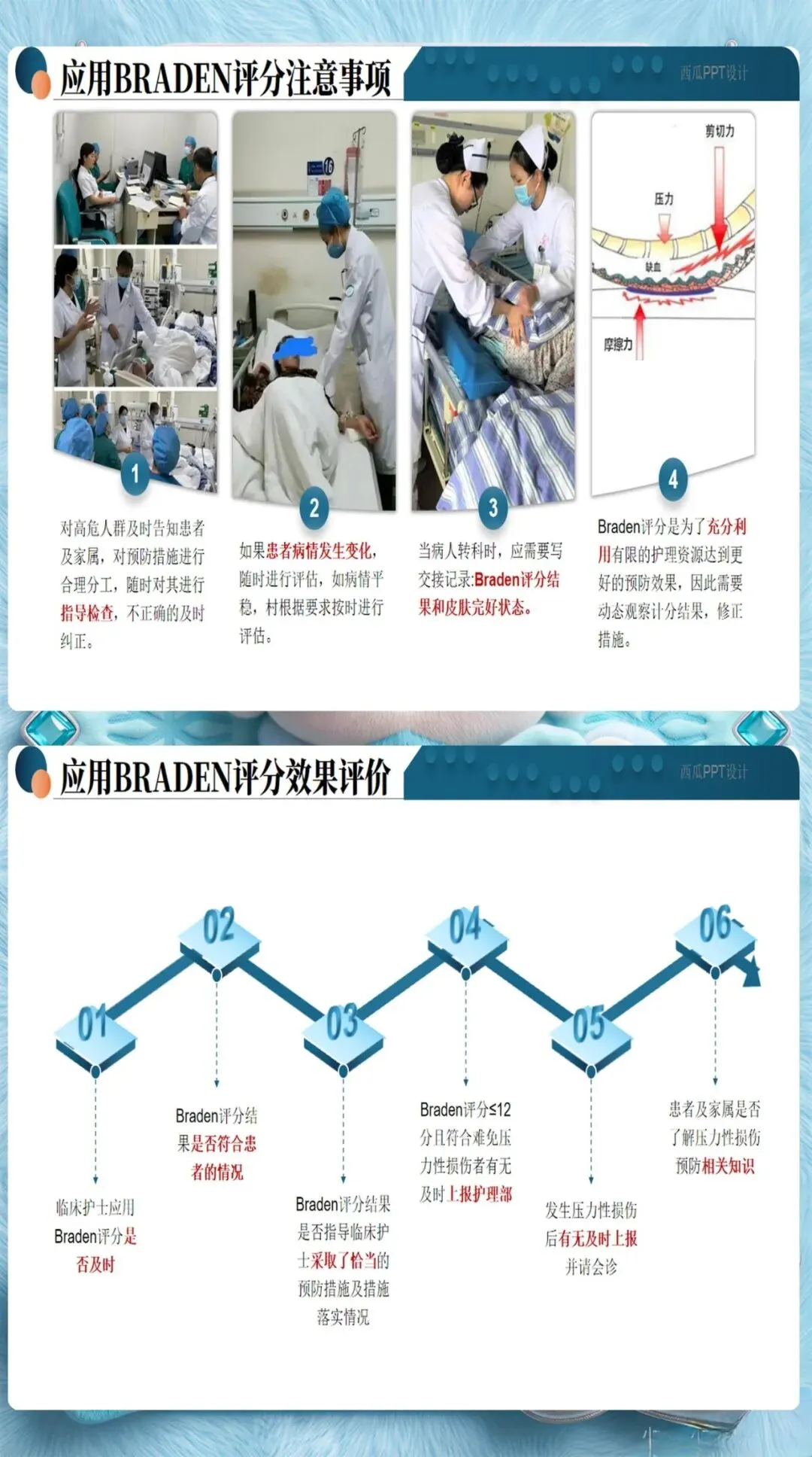 Braden量表是临床最常用的评估工具,但很多护士存在一个误区——入院评估一次就完事了。实际上,风险评估应该动态进行: