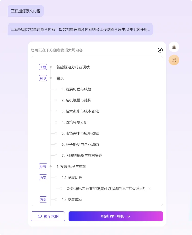 例如,当用户输入“新能源电力行业可持续发展"这一主题时,AI 可以通过分析,提取出“环境保护""社会责任“"经济效益平衡" 等核心诉求。这些核心诉求为 PPT 的内容构建提供了基础的框架和方向。