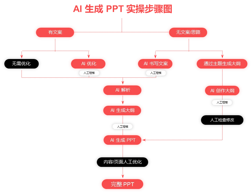 对 AI 生成 PPT 的全流程建立清晰的结构化逻辑,是实现内容精准输出的核心方法论。图中的流程从“素材分类(有文案/ 无文案)”到“最终 PPT 交付”,形成了一条闭环链路: