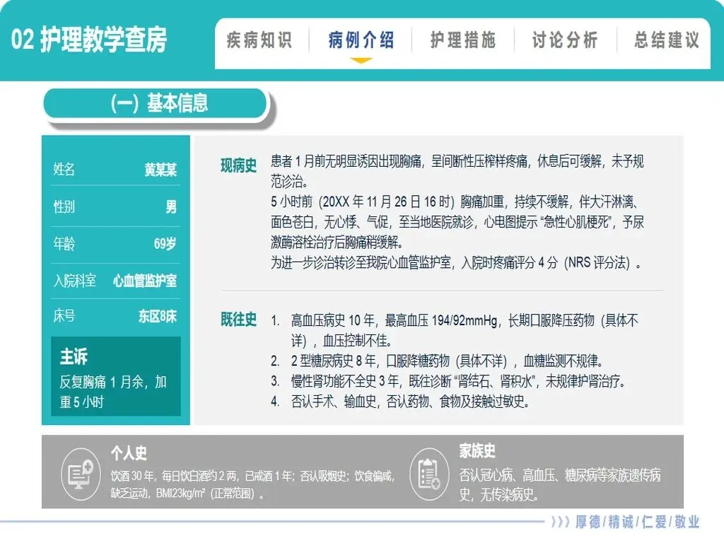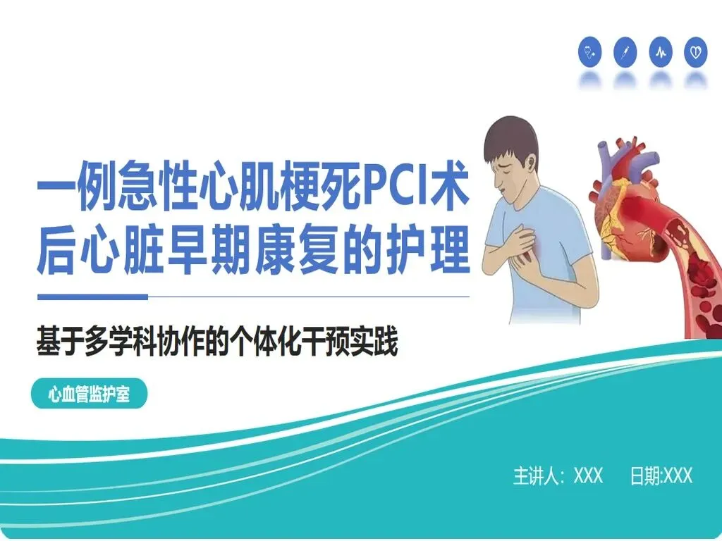 这套一例急性心肌梗死PCI术后心脏早期康复的护理PPT,共40页,从疾病知识到病例分析,从护理诊断到分阶段康复方案,完整呈现了这类复杂患者的全程护理要点。