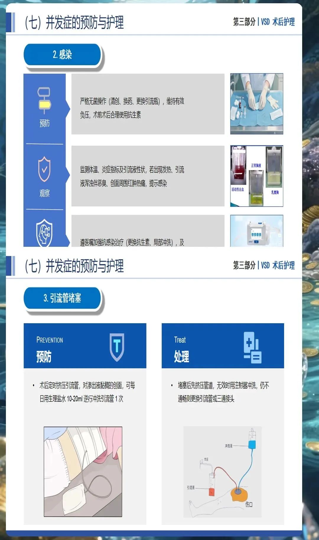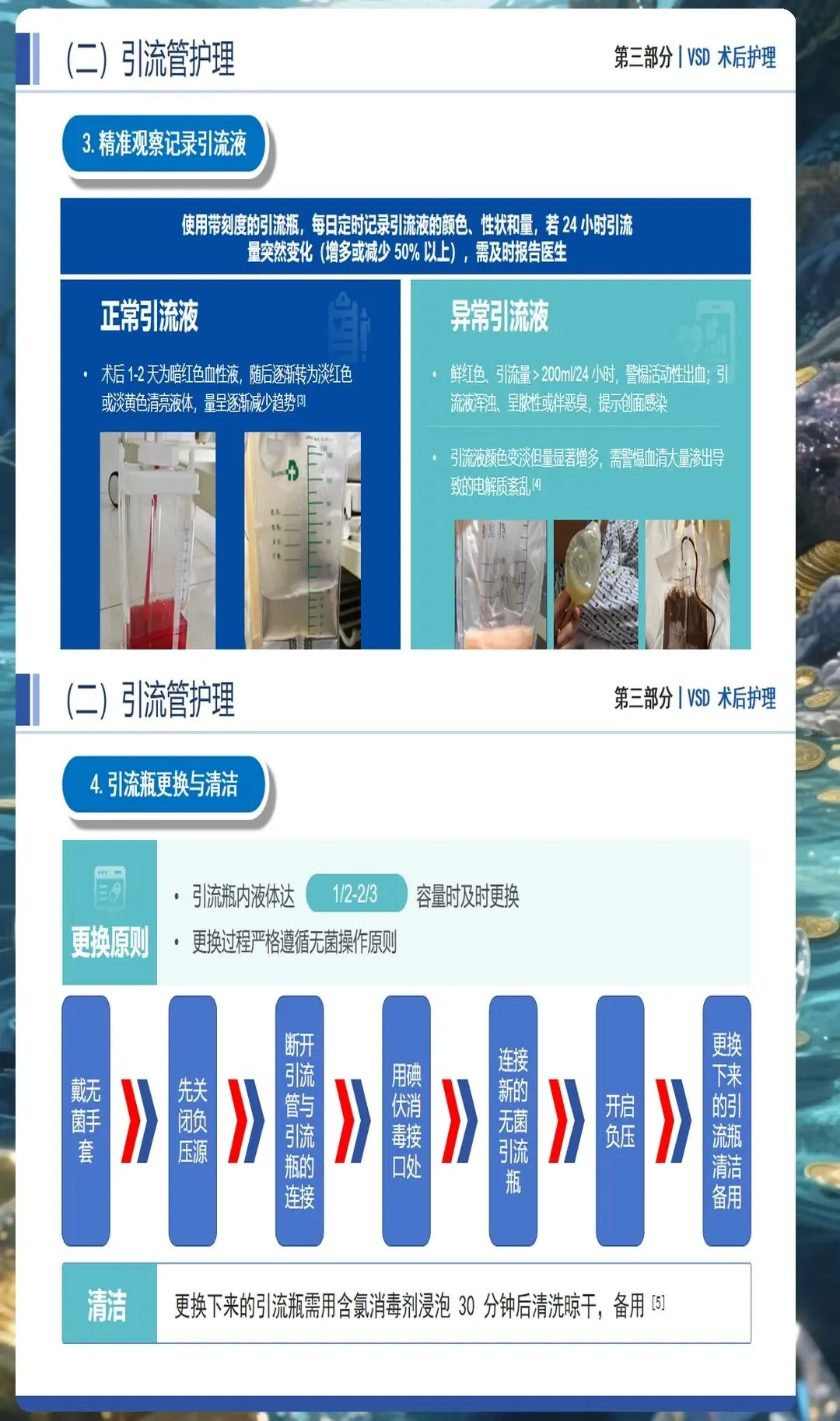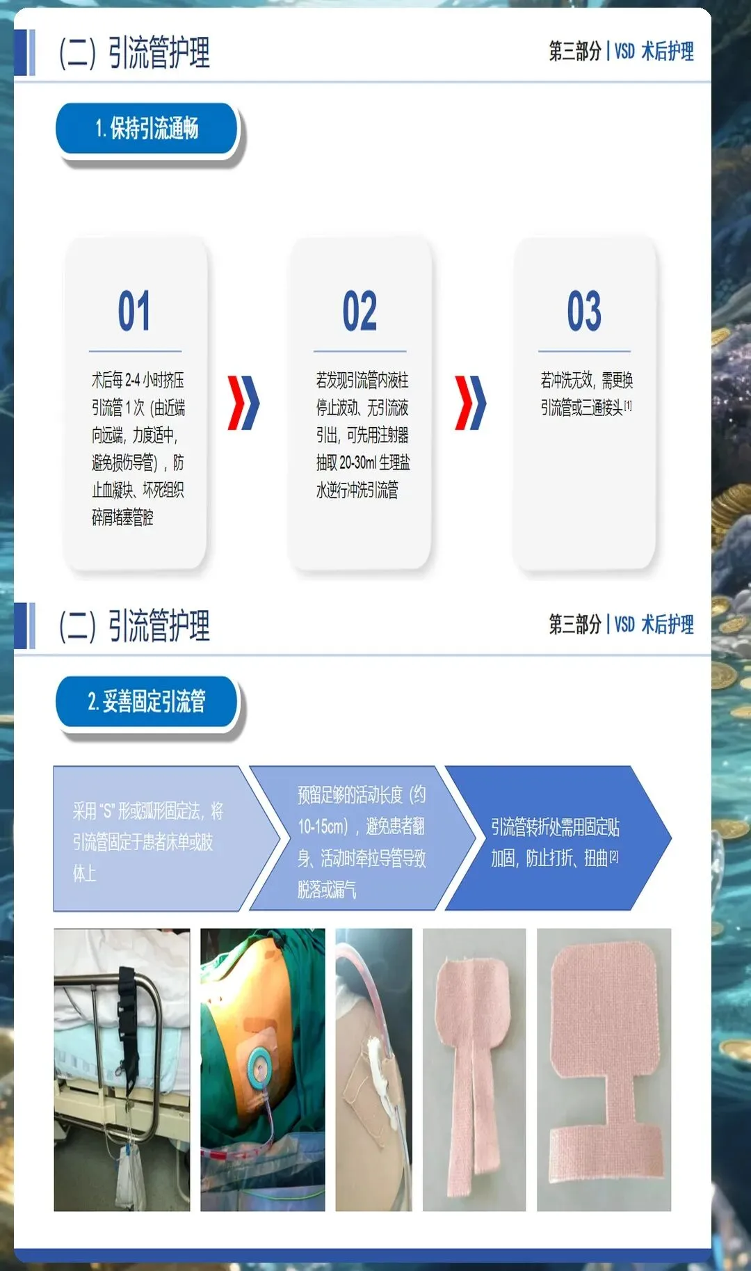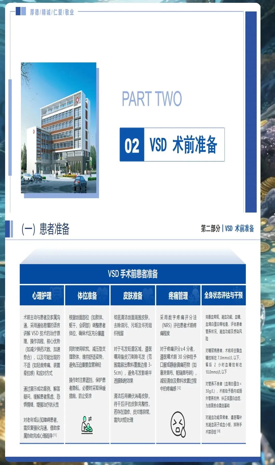 术前向患者及家属解释VSD的原理、注意事项、配合要点。循证研究表明:充分的患者教育能显著提高依从性,减少因体位不当导致的引流管脱落。