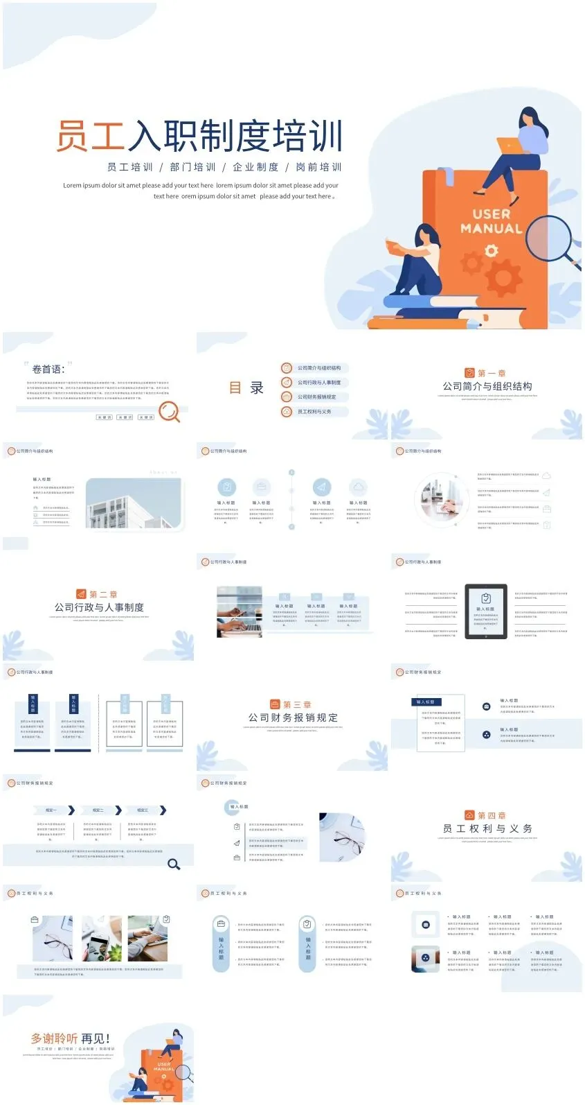 员工入职培训PPT模板19套,可下载可编辑。部分效果如下,完整版下载方式见文末。