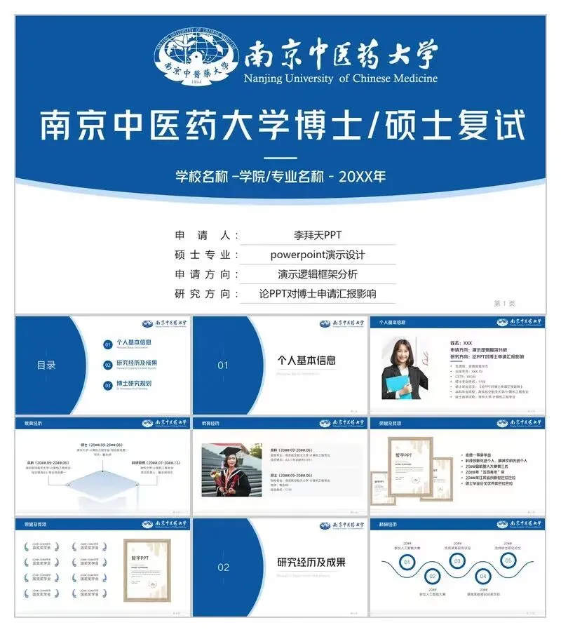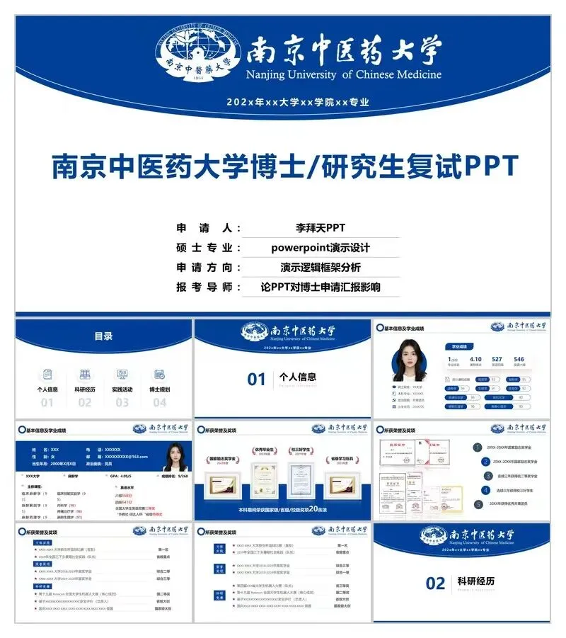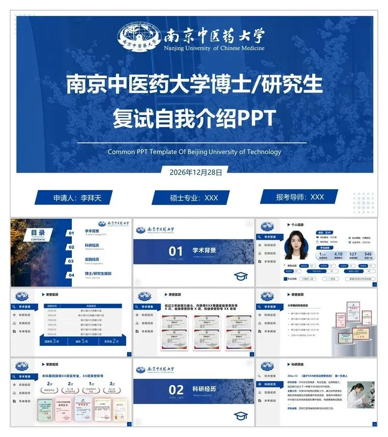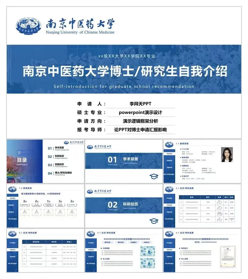 ✨ 专为南京中医药大学博士/硕士复试、保研夏令营定制,蓝白校色+完整学术框架,让你的汇报一眼专业!