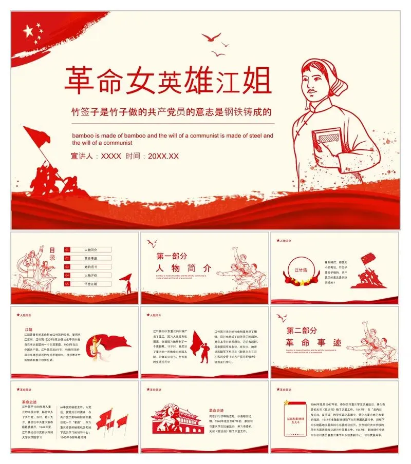 本文分享:英雄故事PPT模板,抗日英雄主题班会,江姐,赵一曼,黄继光等