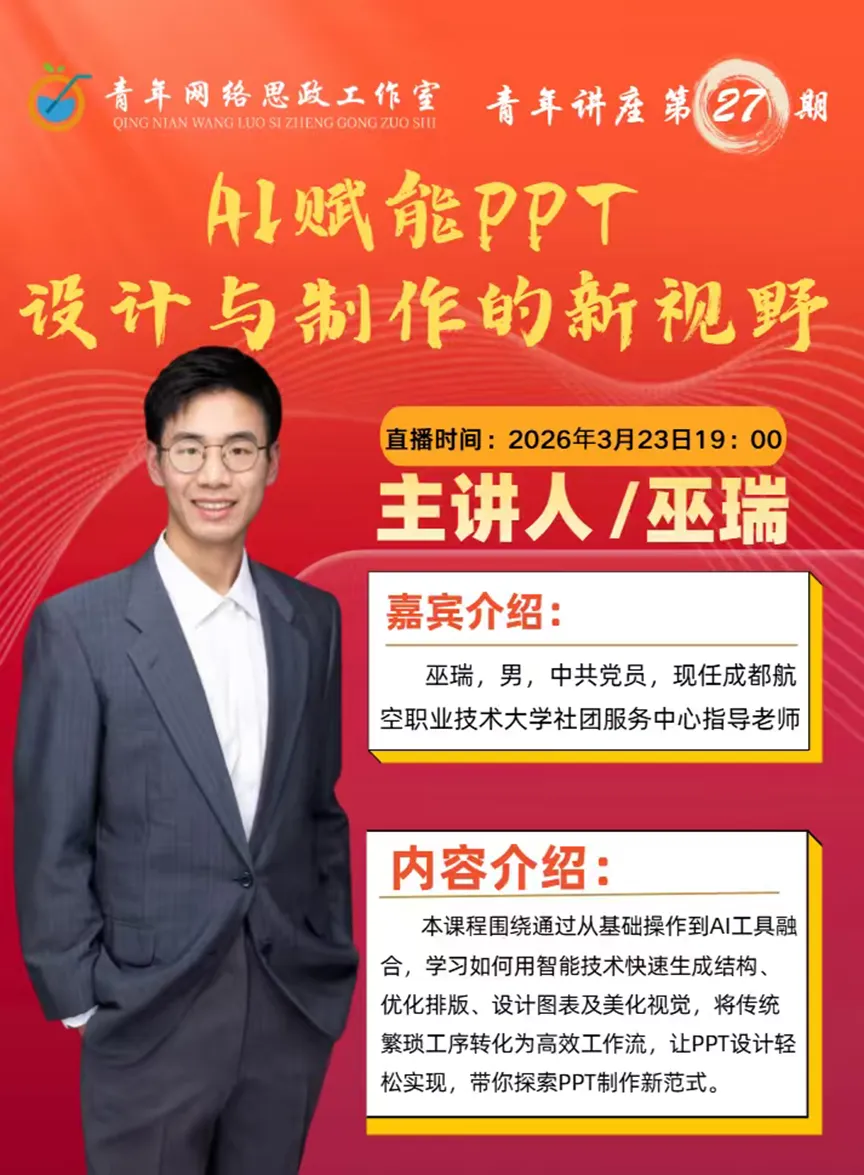 嘉宾介绍:巫瑞,男,中共党员,现任成都航空职业技术大学社团服务中心指导老师。