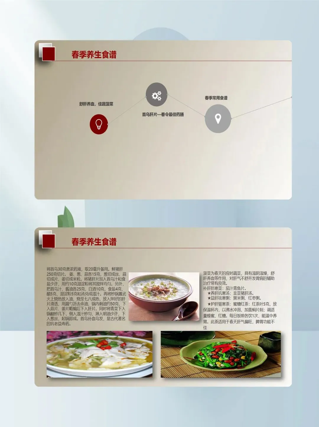 春季肝气旺盛,宜疏肝养血。饮食多食温补阳气的葱、蒜、韭菜及菠菜等。推荐鸡肝粥补血养肝,首乌肝片为春令药膳佳品。保持心情舒畅,避免熬夜。