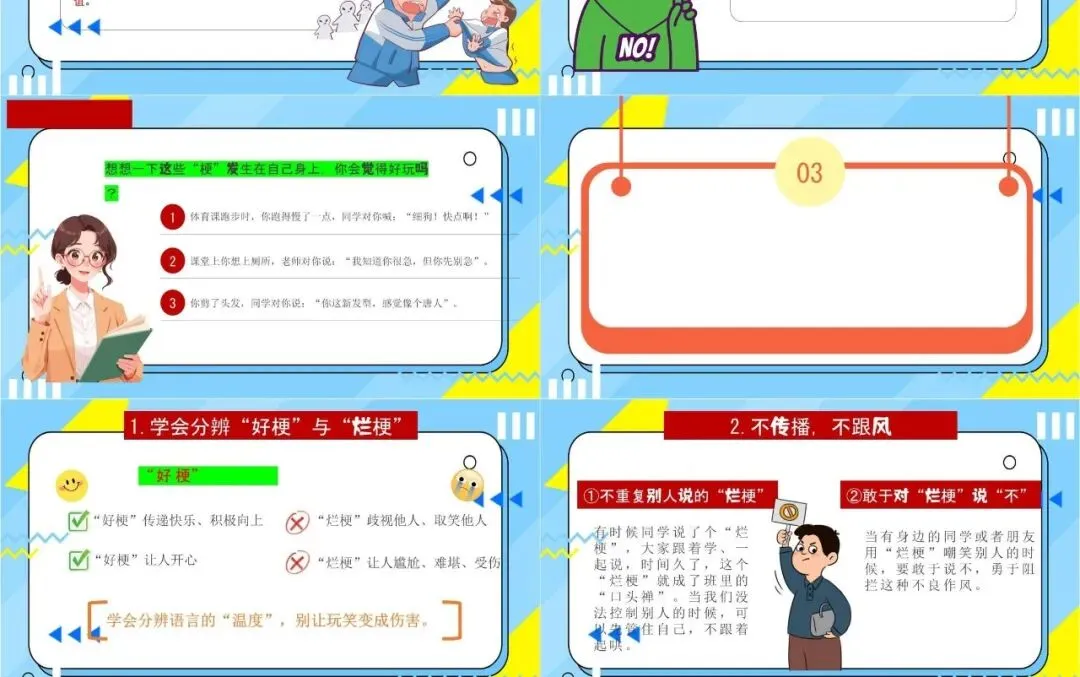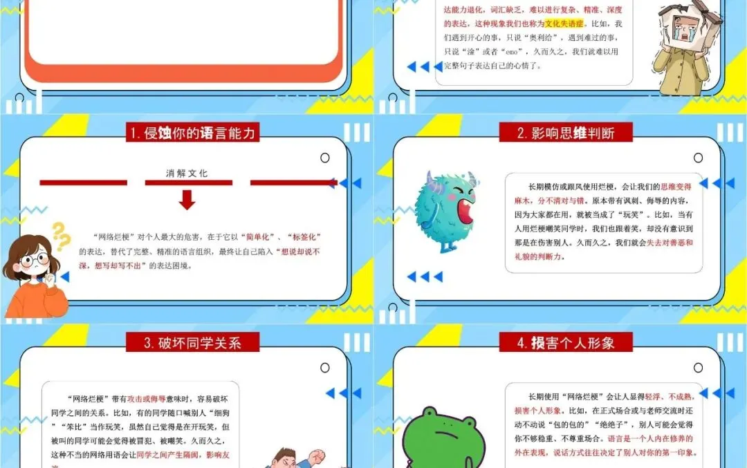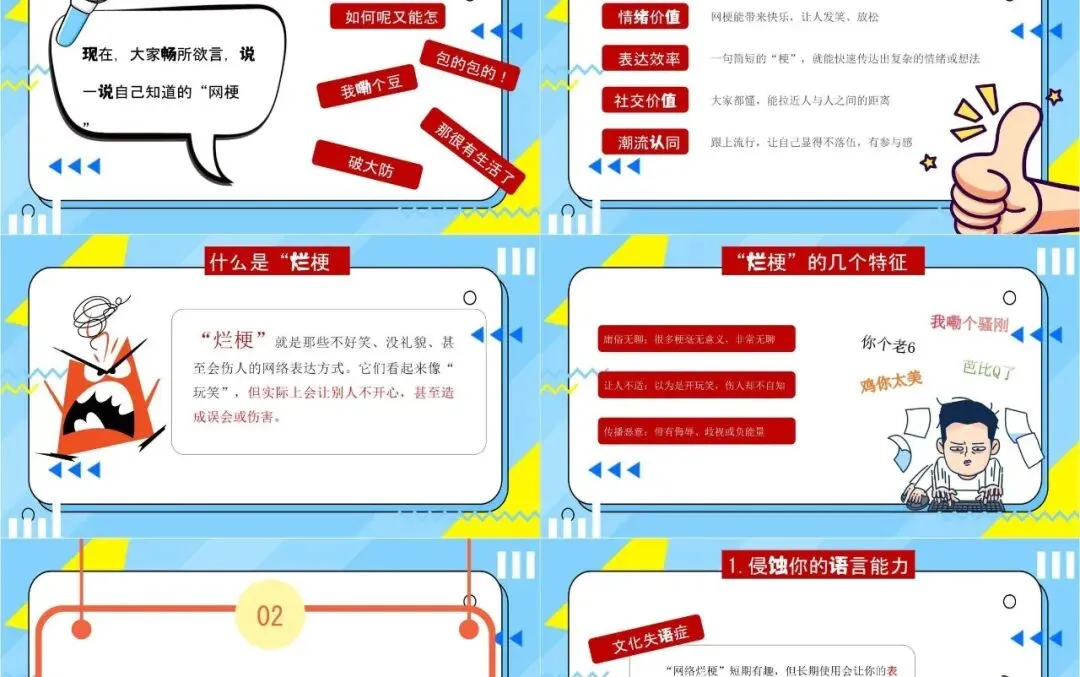 还在为 “拒绝烂梗 好好说话” 主题班会发愁?这套完整 PPT 直接帮你搞定!从 “什么是网络烂梗” 到 “烂梗的危害”,再到 “如何文明表达”,逻辑清晰、内容完整,卡通风格生动有趣,学生爱看也容易听懂。包含封面、目录、知识点讲解、互动环节和总结页,可直接套用修改,省去你熬夜做课件的时间。不管是小学还是初中的思想教育班会,都能完美适配,帮你轻松引导学生远离低俗烂梗,学会好好说话、文明表达。(因为篇幅有限,仅提供部分预览)