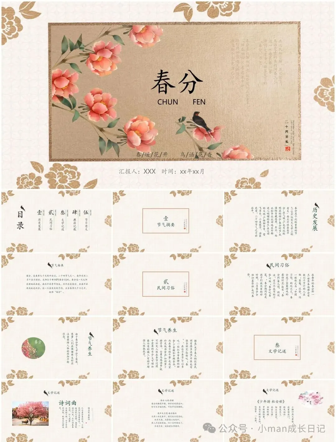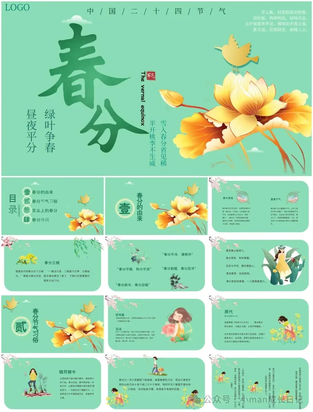春分至,昼夜均而寒暑平,万物至此皆生长。小编精选 27 套春分节气PPT模板,融传统节气智慧与现代设计美学于一体,内容涵盖农事科普、文化习俗、养生指南、踏青活动等多个维度,以清新雅致的视觉语言,助您生动呈现节气文化的深厚内涵与自然时序的灵动韵律。