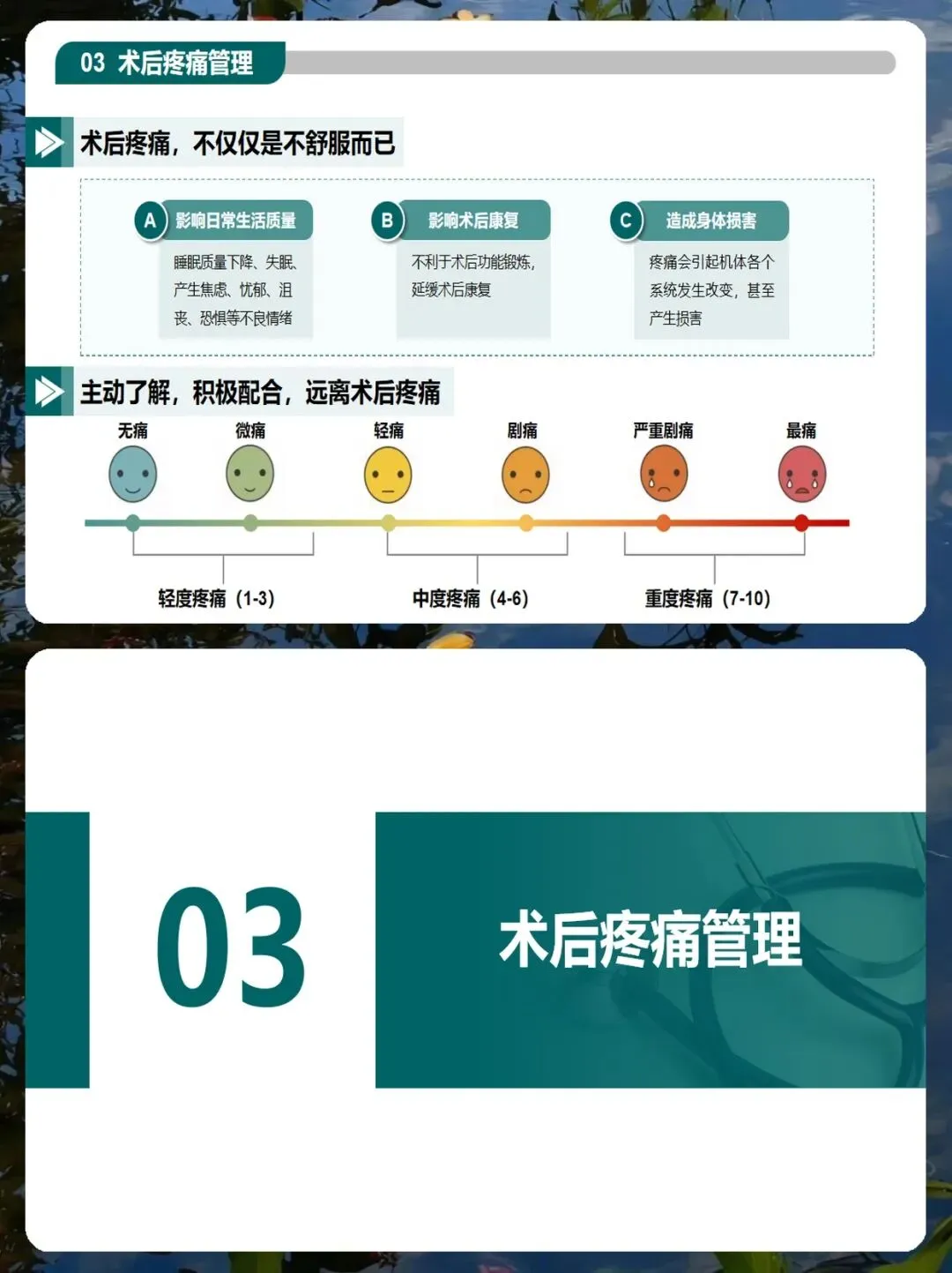 第二,术后疼痛管理。 疼痛管理是ERAS成功的关键节点。研究强调,疼痛不仅影响睡眠与情绪,更会延缓术后康复。 管理策略上,必须摒弃“忍痛”观念,推行多模式镇痛。 执行要点上,患者需主动报告疼痛,医护人员需评估休息及活动时的疼痛强度。镇痛药物需按时使用,不可擅自停药或减量,以确保患者在无痛状态下进行早期功能锻炼。