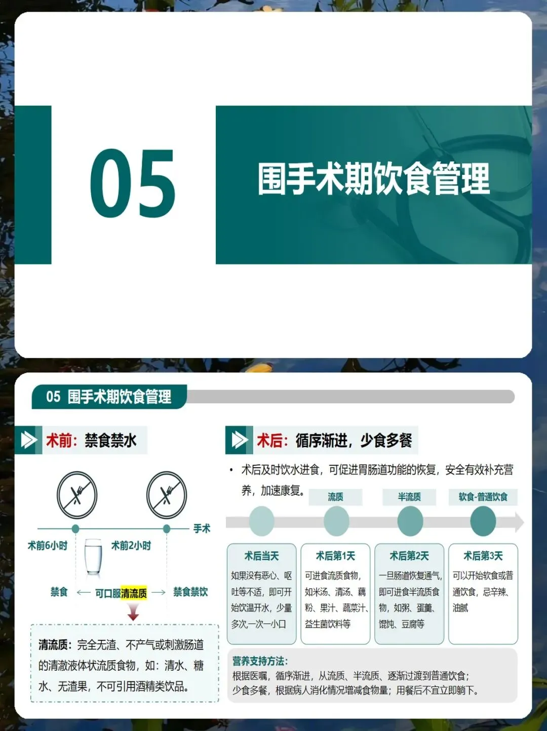 第三,围手术期营养与饮食管理。 术后营养支持强调循序渐进,尽早进食。 在术后饮食阶梯方面,建议术后当天少量多次饮温开水,若无恶心呕吐,术后第一天可进流质,术后第二天肠道通气后进半流质,术后第三天可过渡至软食或普食。 在膳食原则方面,推荐参考“平衡膳食宝塔”及“十个拳头”原则,保证谷类、蔬菜水果、肉蛋奶豆的均衡摄入,忌辛辣油腻,以促进伤口愈合与免疫力提升。