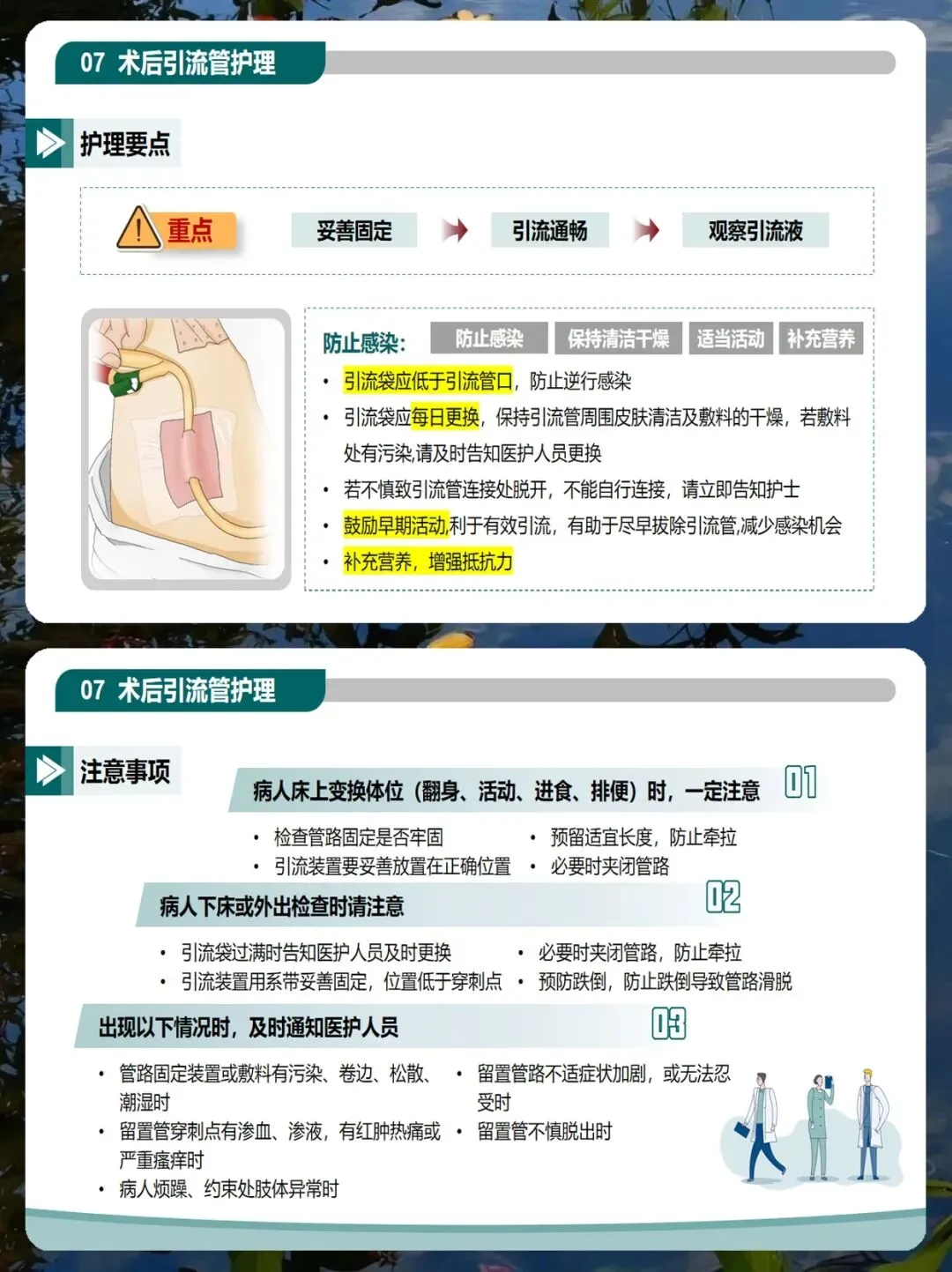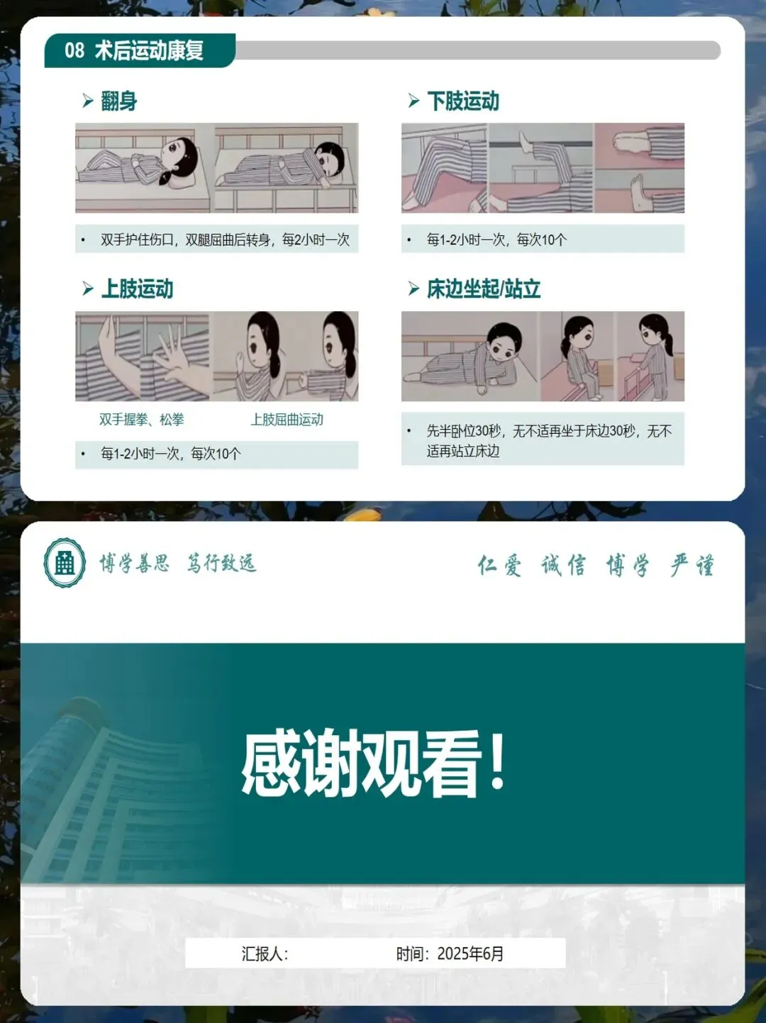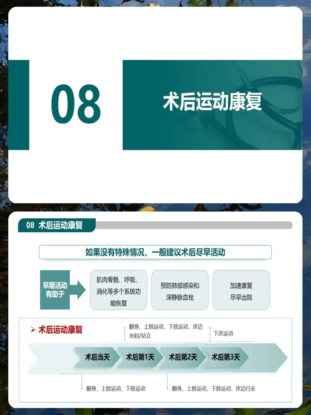 第四,术后引流管与运动康复。在引流管护理方面,核心原则是尽早拔除。通过妥善固定、保持通畅及预防感染,减少因留置管路带来的不适与感染风险。 在早期活动方面,这是预防深静脉血栓、肺部感染及促进胃肠功能恢复的核心措施。 术后当天即可开始床上翻身及肢体活动。 术后第一天进行上肢屈曲、握拳及床边坐起站立训练。 术后第二至三天鼓励下床行走。活动量应循序渐进,以患者耐受为度。