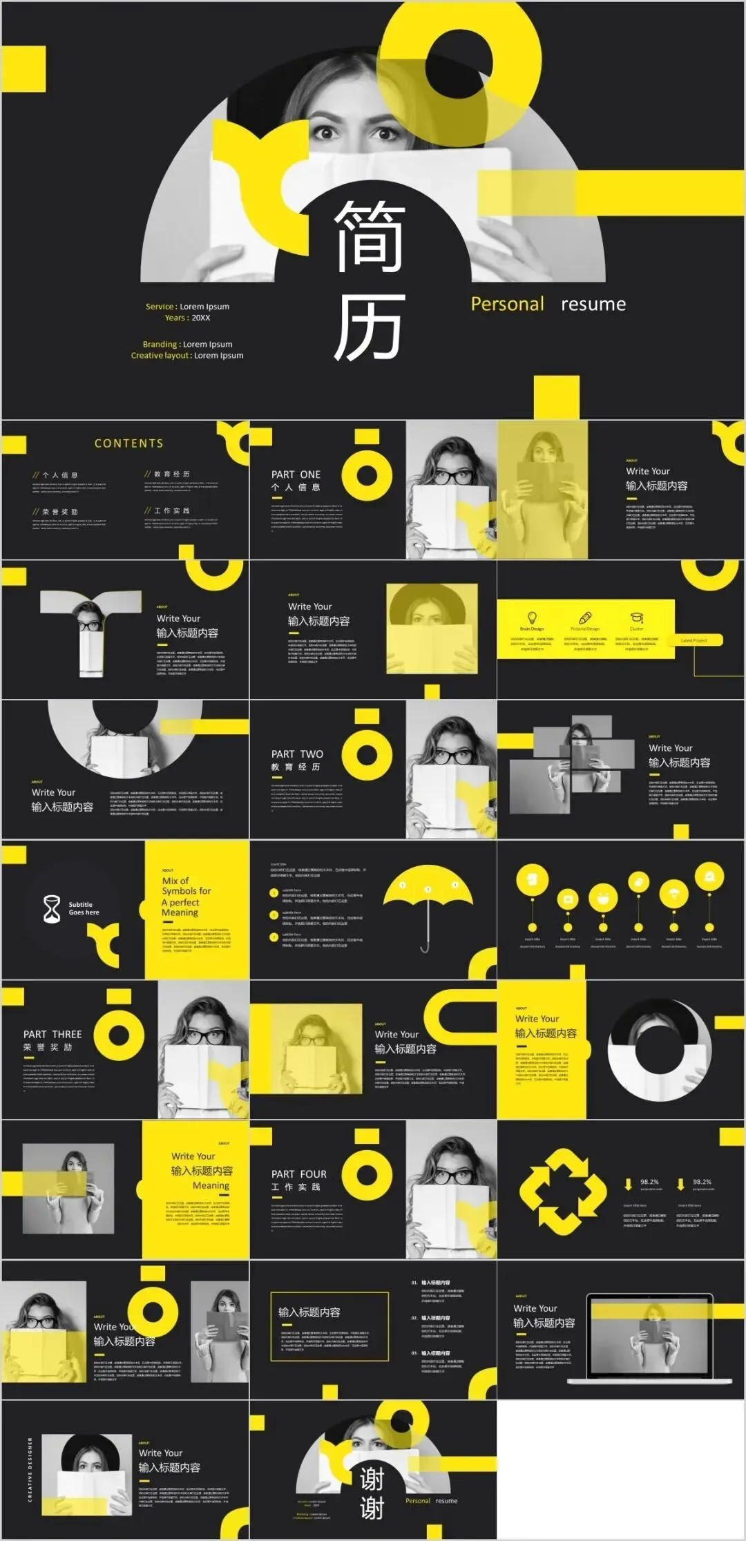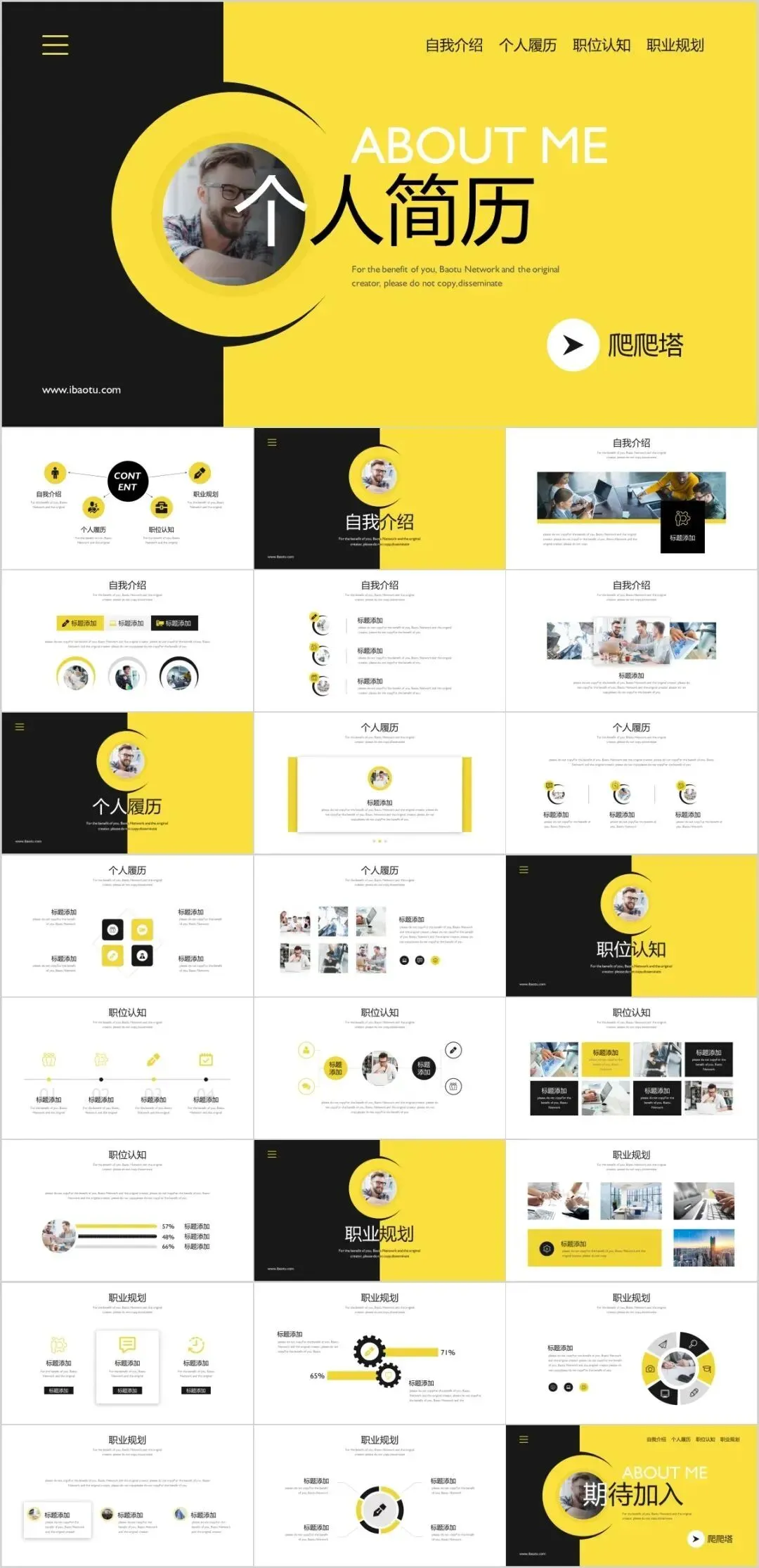 这些简历模板都是免费分享的载后,你可以根据自己的情况,修改文字、图片、颜色等,轻松制作出一份专属于你的个人简历PPT。