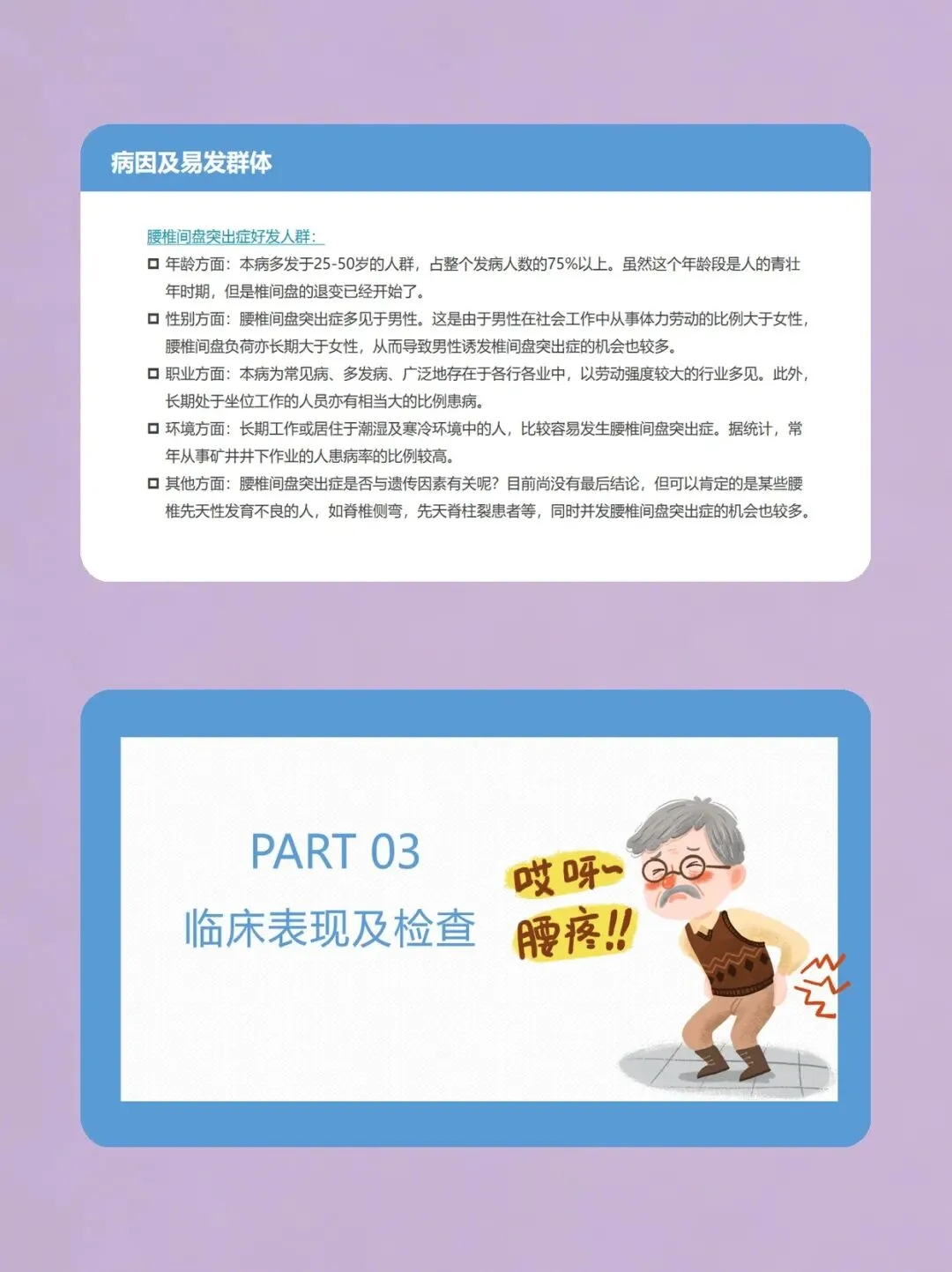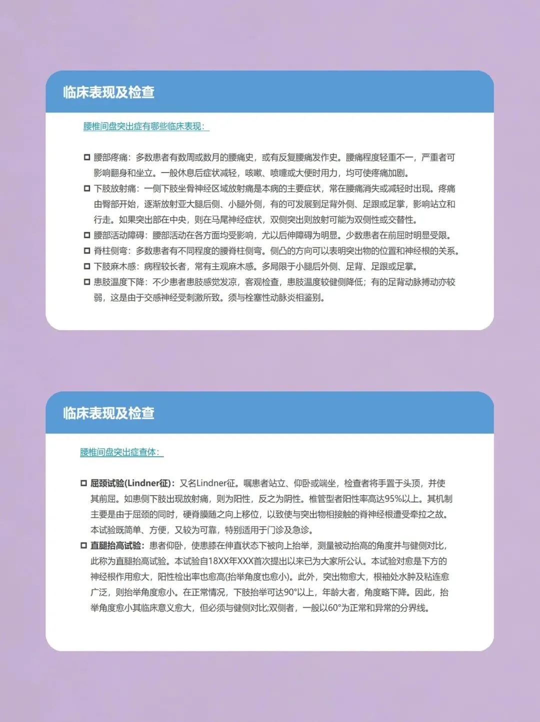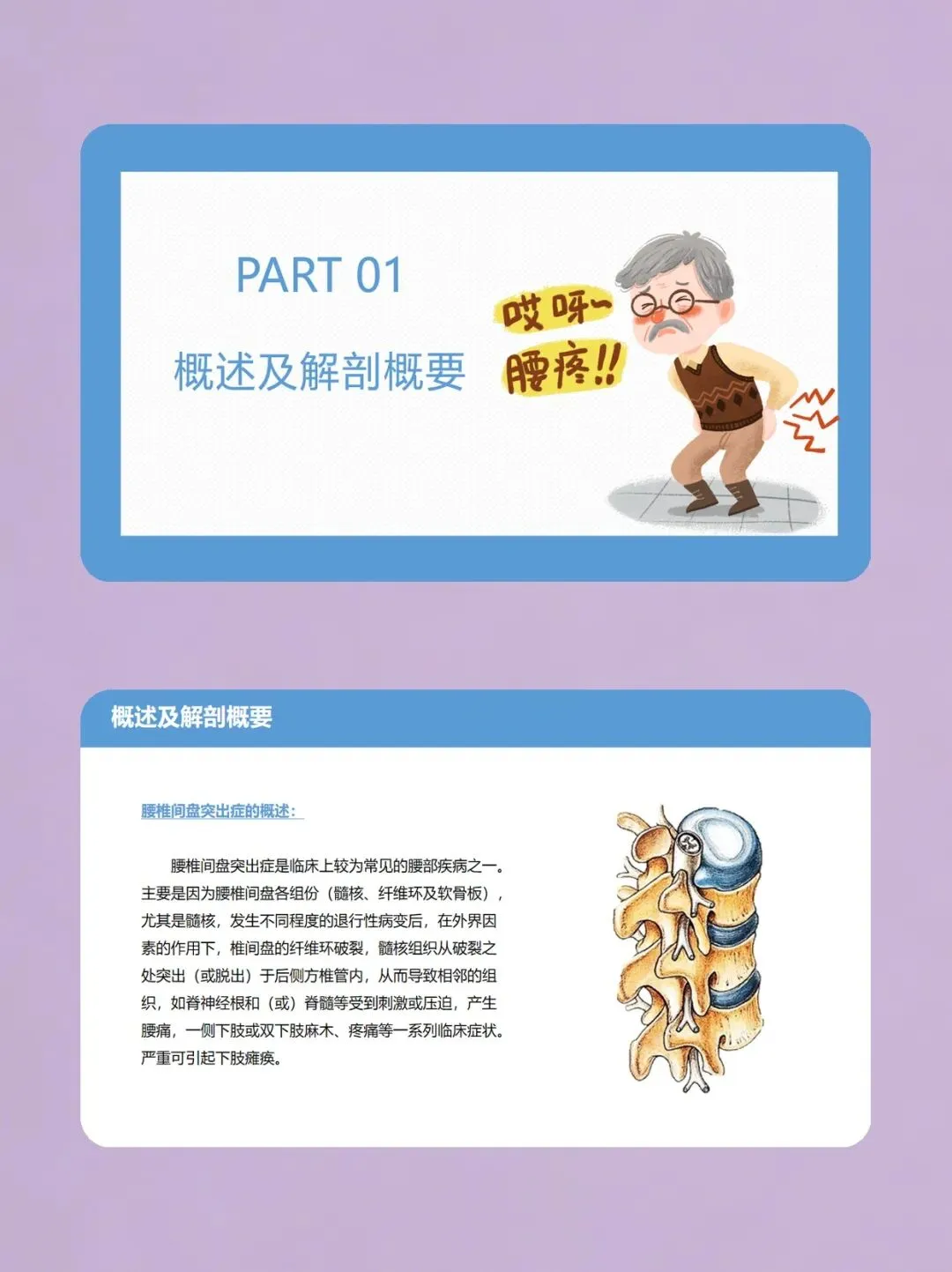 腰椎间盘突出症是临床上较为常见的腰部疾病之一。主要是因为腰椎间盘各组份(髓核、纤维环及软骨板),尤其是髓核,发生不同程度的退行性病变后,在外界因素的作用下,椎间盘的纤维环破裂,髓核组织从破裂之处突出(或脱出)于后侧方椎管内,从而导致相邻的组织,如脊神经根和(或)脊髓等受到刺激或压迫,产生腰痛,一侧下肢或双下肢麻木、疼痛等一系列临床症状。严重可引起下肢瘫痪。