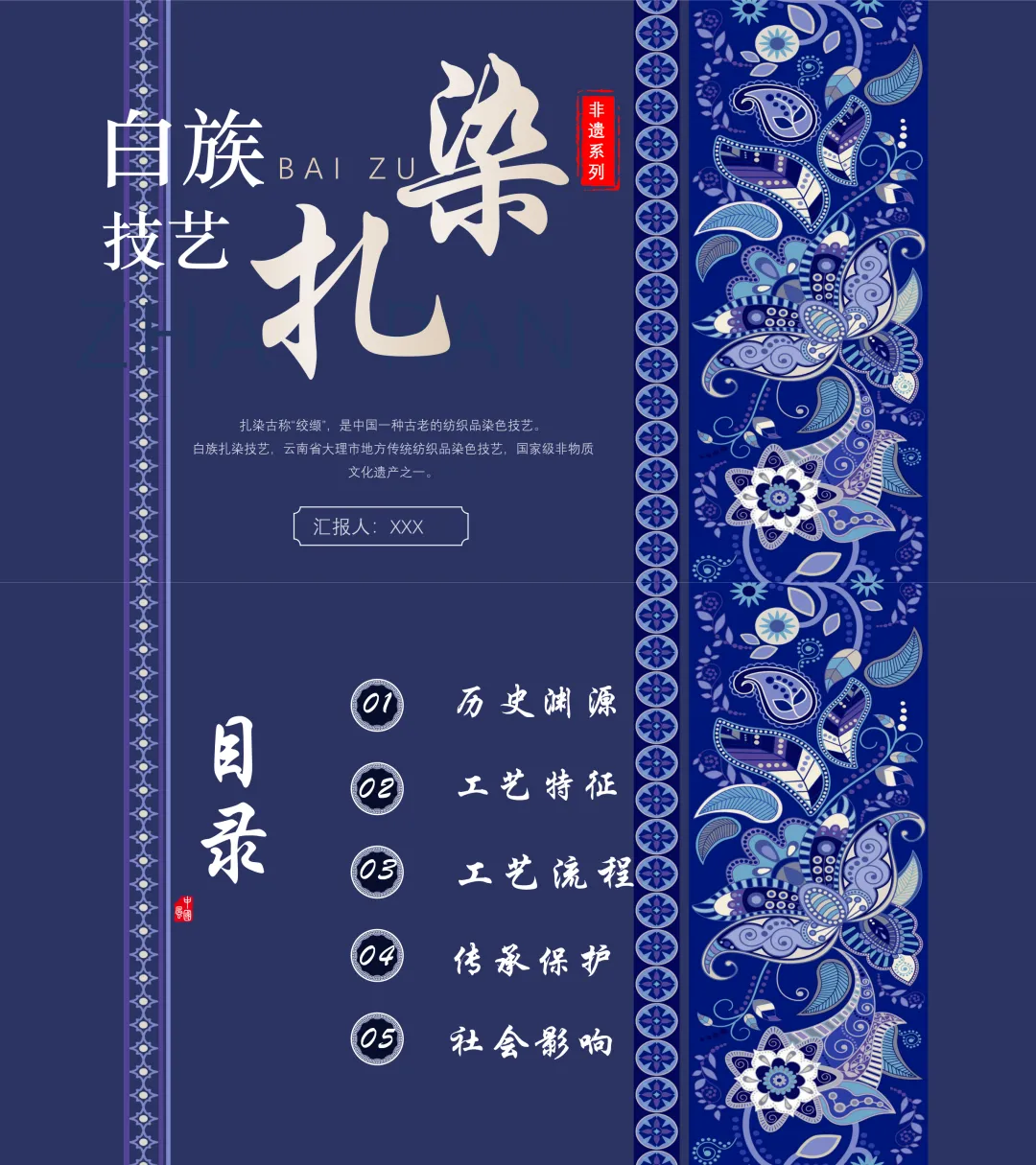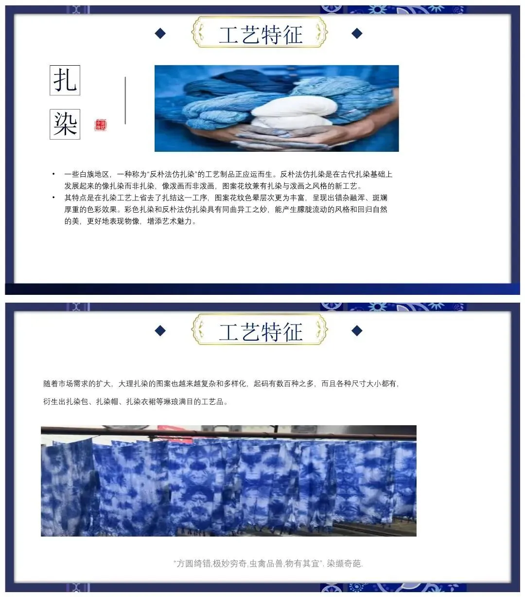 白族扎染技艺,云南省大理市地方传统纺织品染色技艺,扎染古称“绞缬”,是中国一种古老的纺织品染色技艺。扎染一般以棉白布或棉麻混纺白布为原料,染料主要是植物蓝靛(云南民间俗称板兰根)。