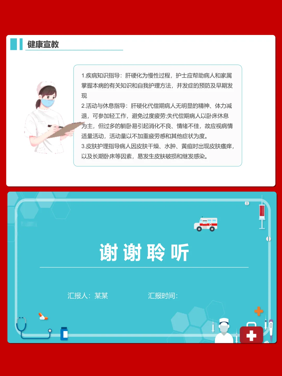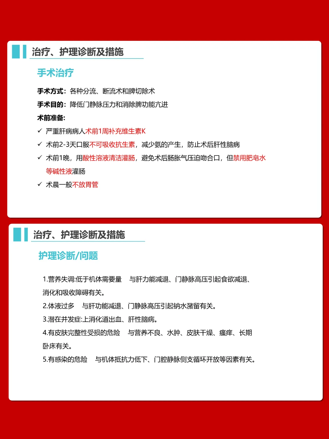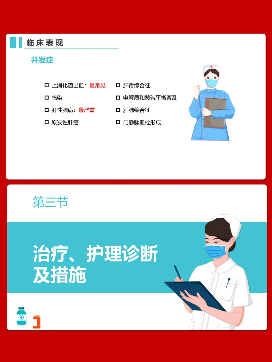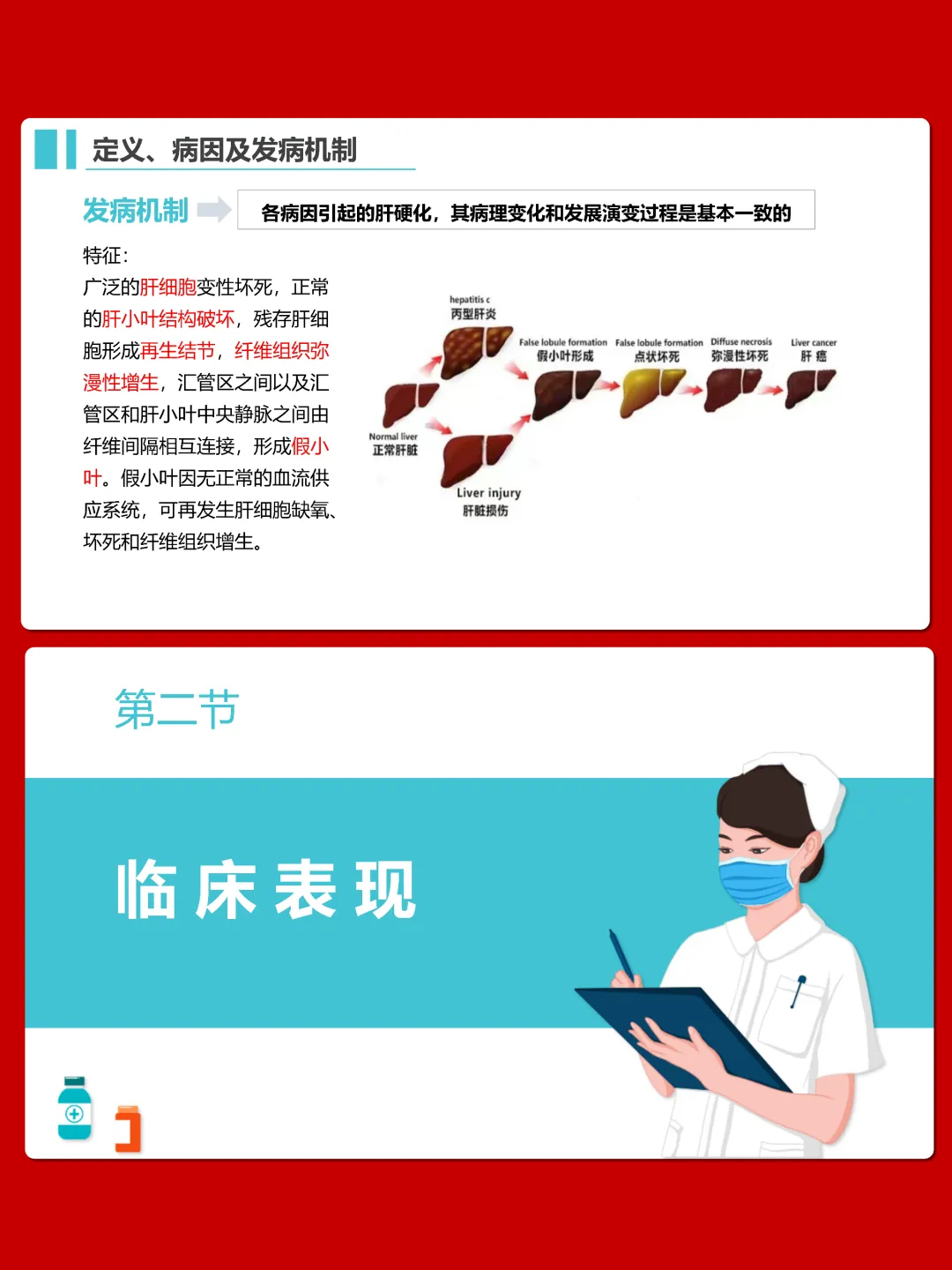 今天我们重点学习肝硬化病人的护理知识。肝硬化是由不同病因引起的慢性、进行性、弥漫性肝病,核心表现为肝功能损害和门静脉高压,晚期易出现多种严重并发症。