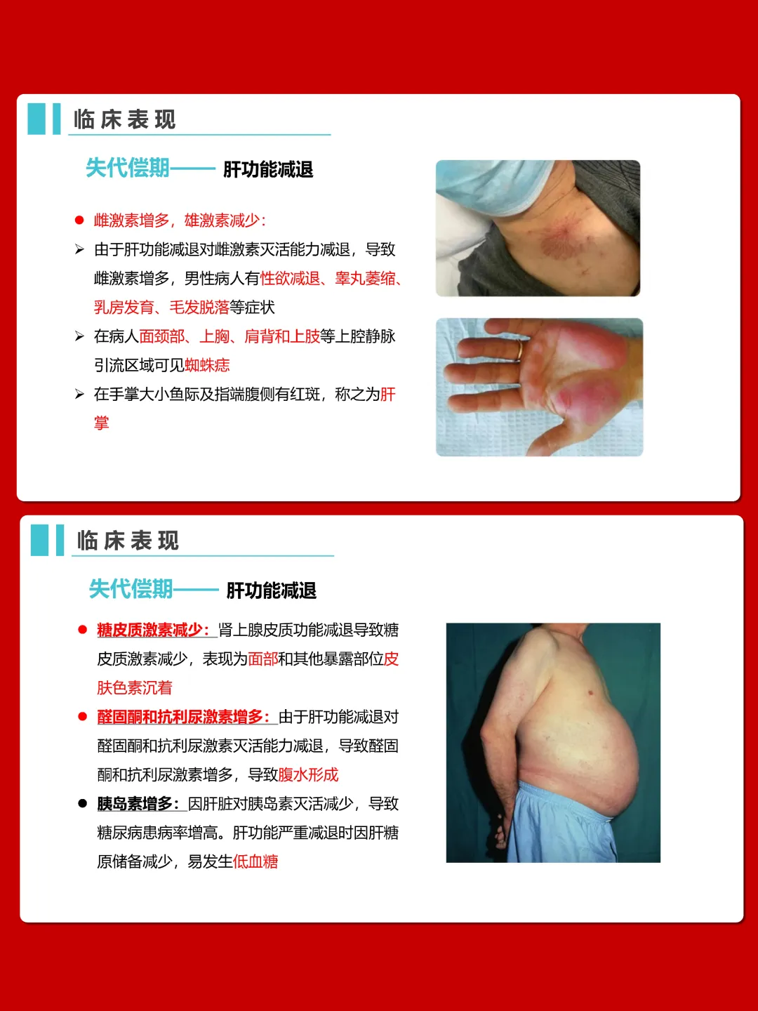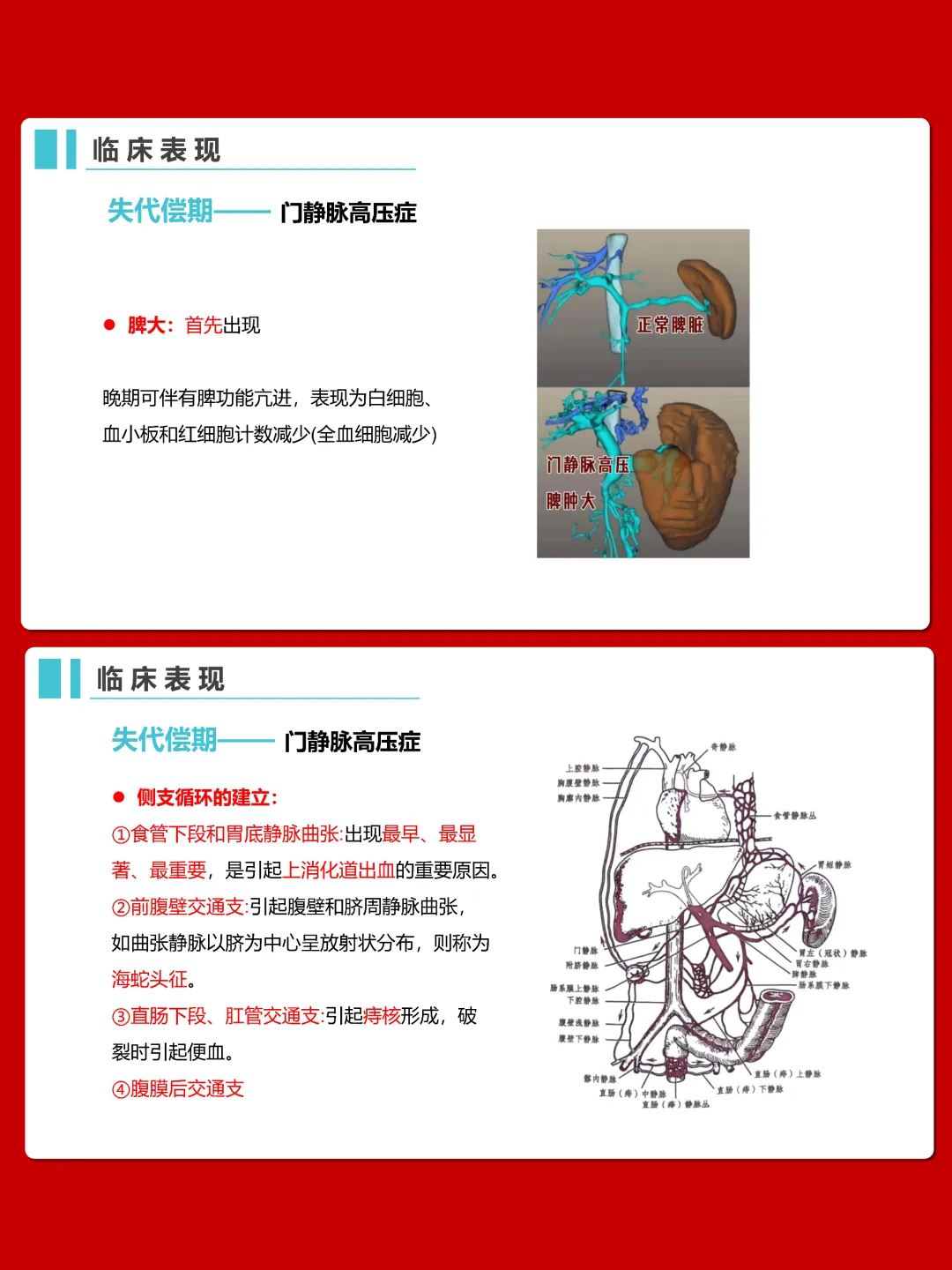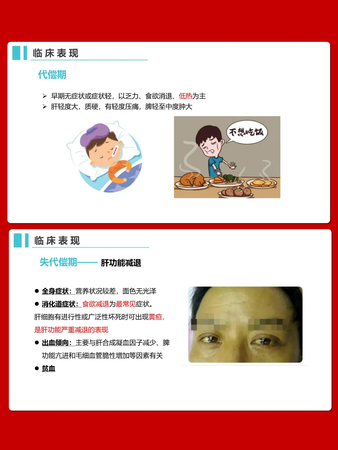 临床表现分为代偿期和失代偿期。代偿期症状较轻,以乏力、纳差等为主;失代偿期会出现肝功能减退和门静脉高压,表现为肝病面容、黄疸、出血贫血、脾大、腹水、食管胃底静脉曲张等。