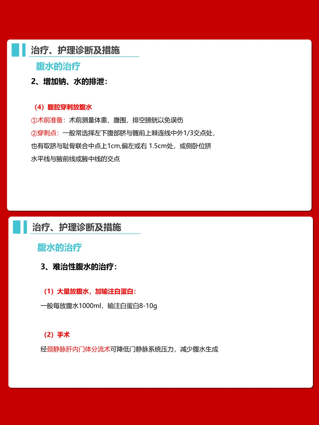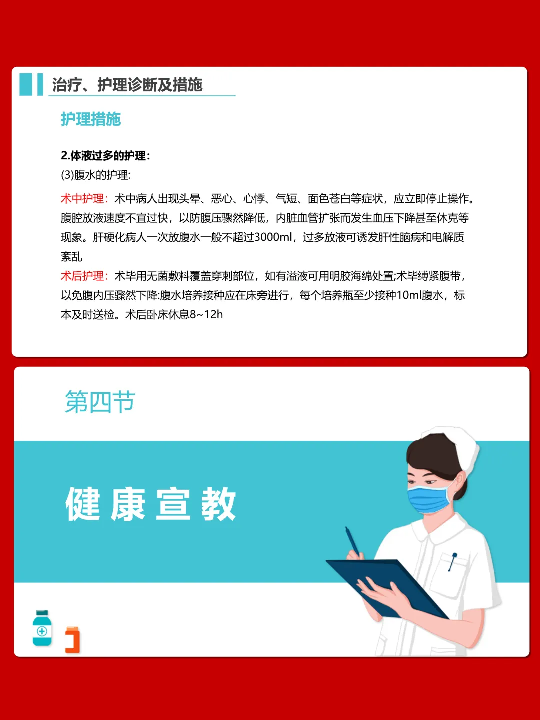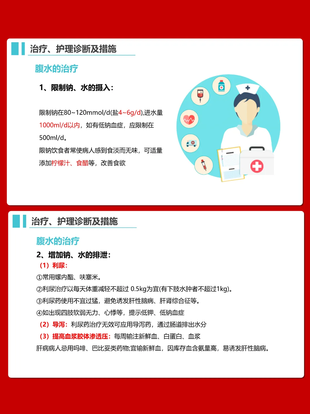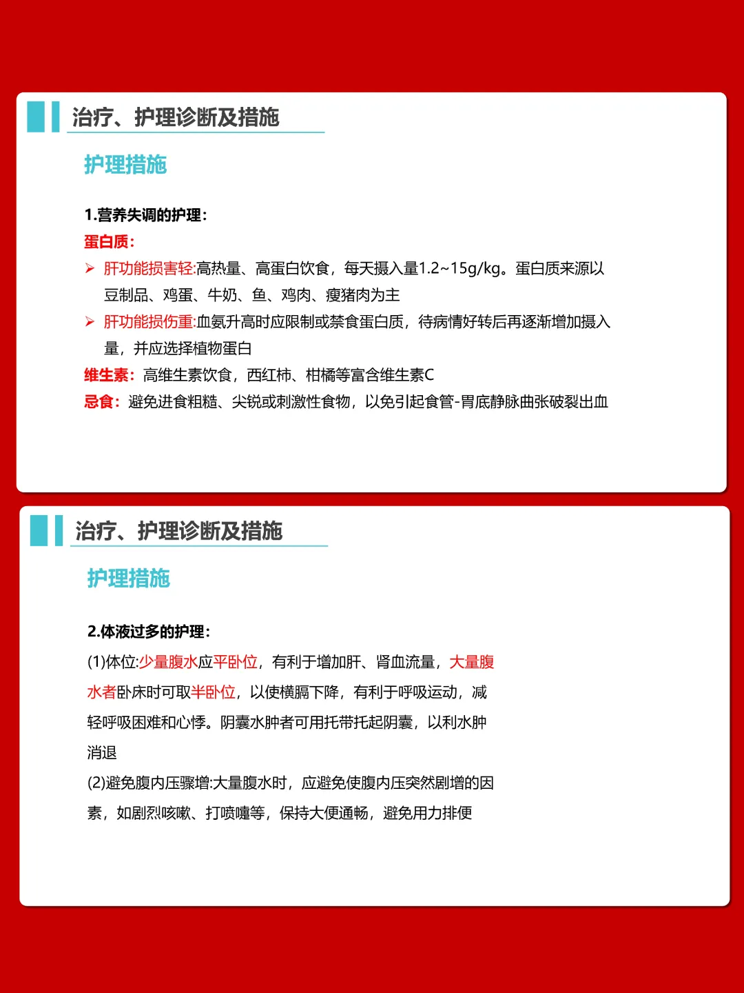 护理方面,要做好营养支持,遵循高热量、高蛋白、高维生素、低纤维素饮食原则,限制钠水摄入。针对体液过多,采取半卧位,合理使用利尿剂,监测尿量和腹围。同时要关注患者活动耐力、皮肤状况,预防上消化道出血、肝性脑病等并发症,做好心理护理和健康指导。