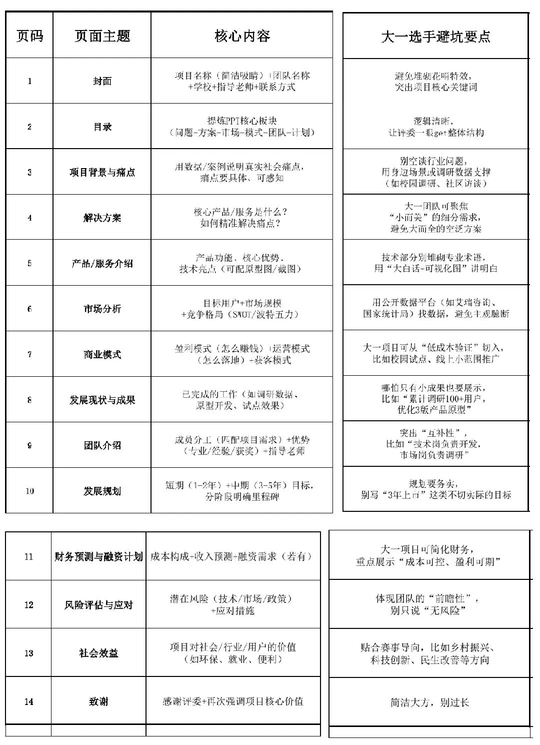 ❌ 不看赛事规则:不同赛事侧重点不同(如“挑战杯”重社会效益,“三创赛”重商业创新),一定要按赛事通知调整PPT重点。