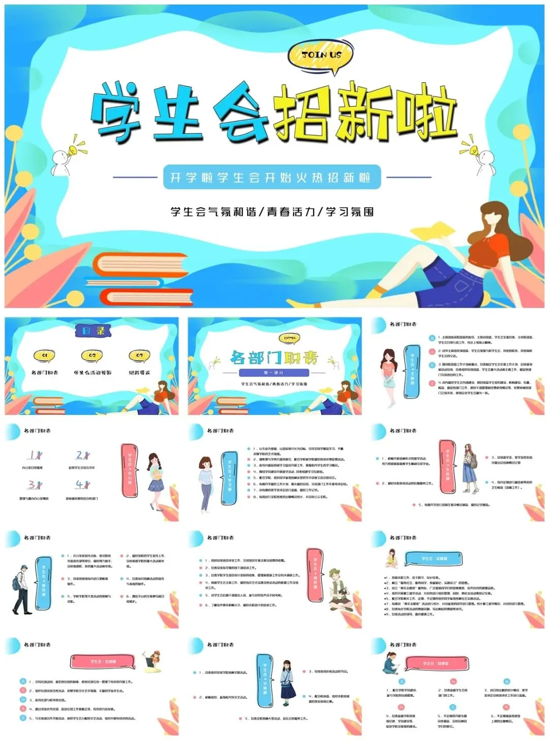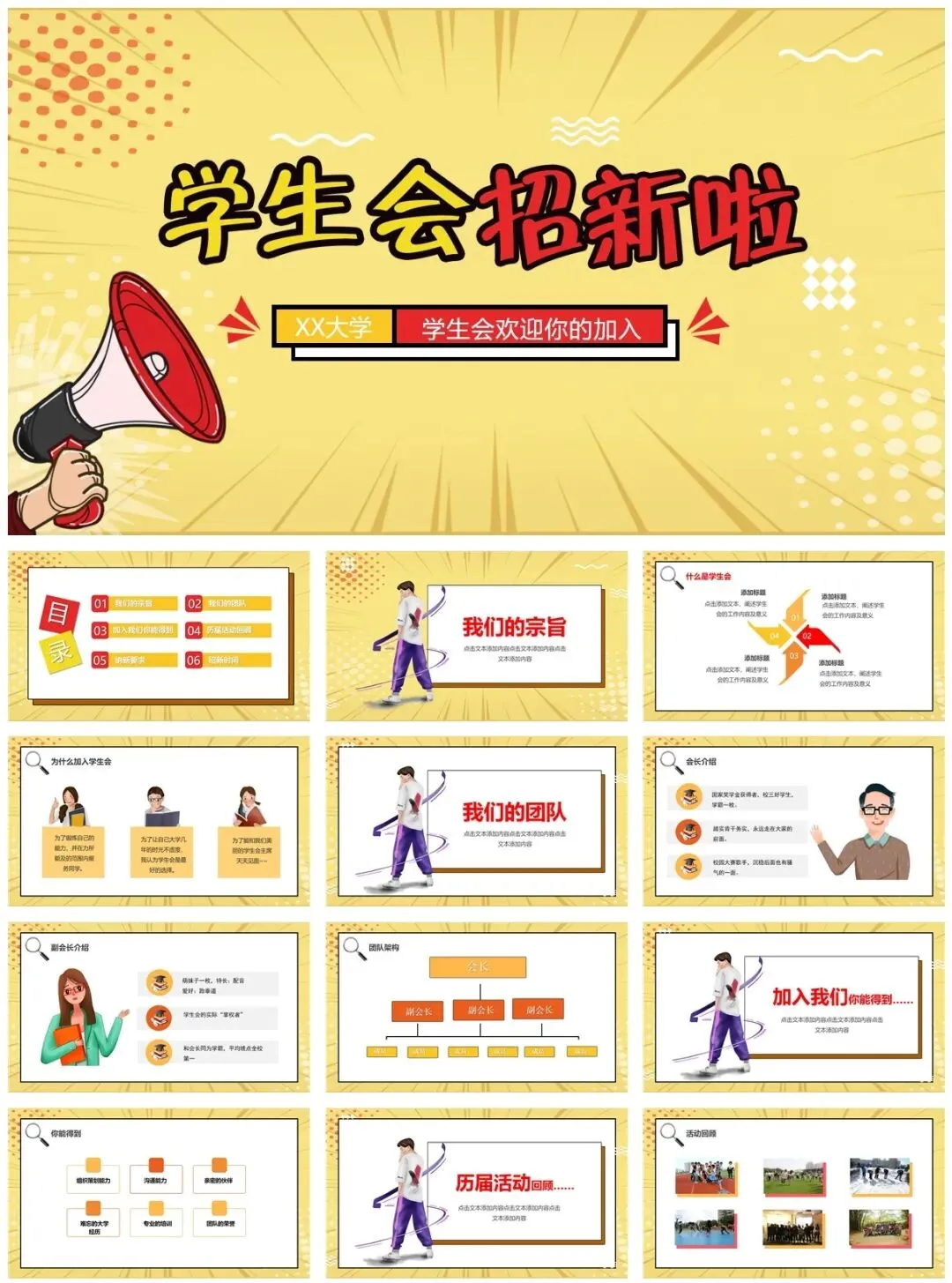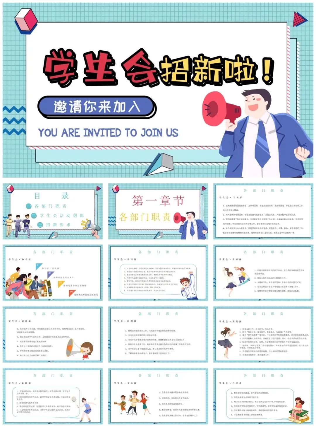 从部门介绍到招新宣讲,从面试攻略到风采展示,这套【学生会招新PPT全系资源】用25种创意设计,将校园组织的魅力转化为视觉吸引力——您的每一次演示,都在点燃新生加入学生会的热情。