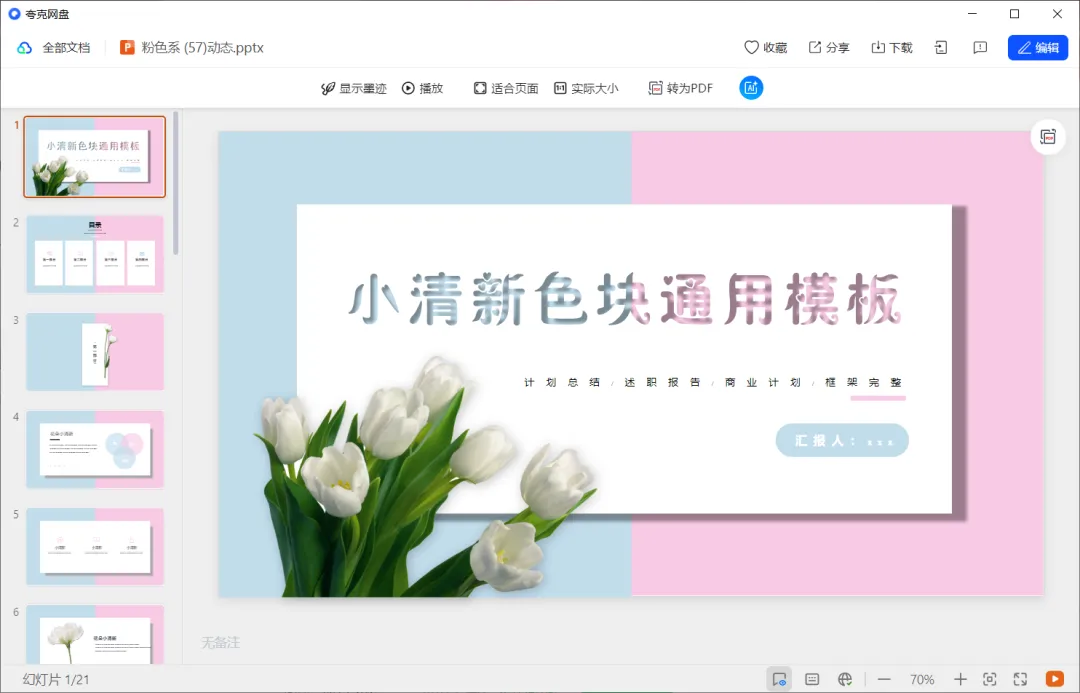 前面给大家分享的都是商务办公、答辩、职业规划等PPT模板,这次的分享就很有意思了,这是一套色系--粉色系,小编觉得这个主题系列还是挺有趣的,这次给大家分享了有9套,可以先收藏一波,需要的时候可以直接下载使用。后面小编会一直给大家分享各类有用的模板和资源,希望大家喜欢!!!!